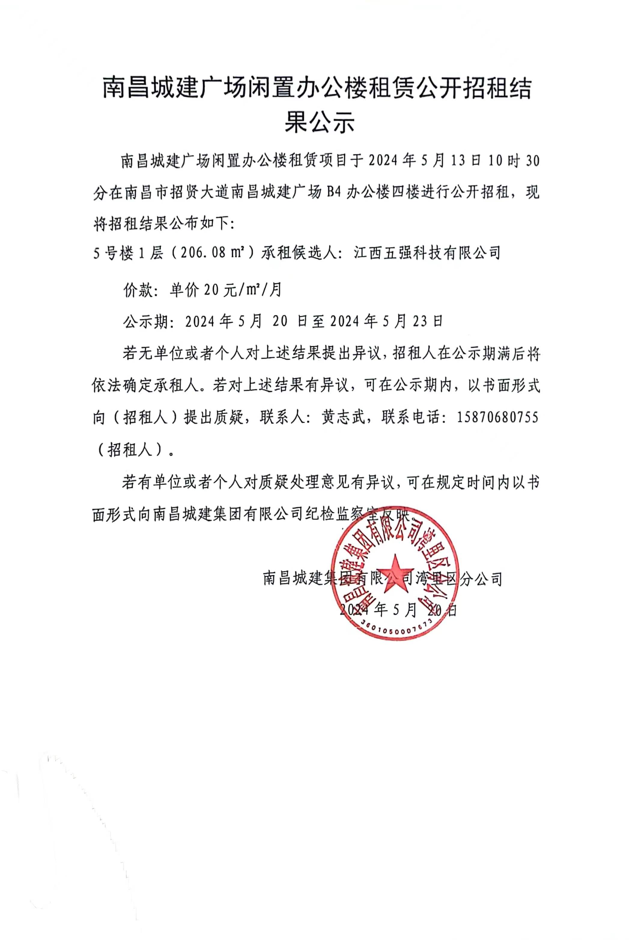 永利yl23411广场闲置办公楼租赁项目于2024年5月13日10时30分在南昌市招贤大道永利yl23411广场B4办公楼四楼进行公开招租,现将招租结果公布如下: