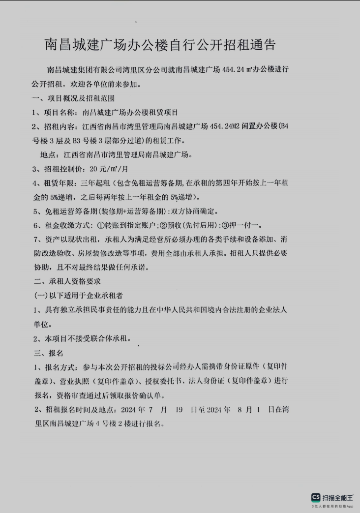 永利yl23411广场办公楼自行公开招租通告