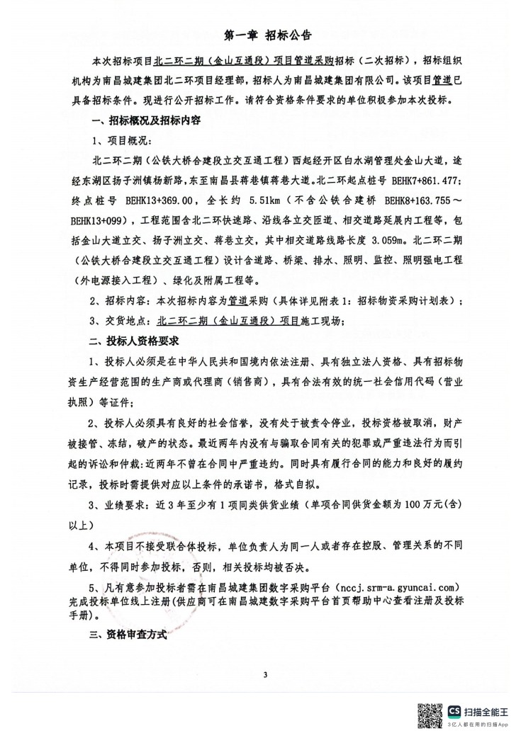永利yl23411集团北二环二期(金山互通段)项目管道采购(二次招标)招标公告