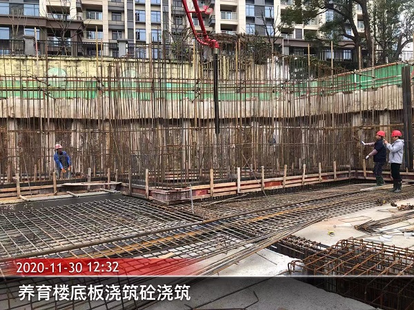 该项目地下室基础底板混凝土浇筑共分七个工区,混凝土浇筑量总计约5000立方米。此次为Ⅰ区地下室(含养育楼及人防区)基础底板混凝土浇筑,浇筑量682立方米,使用汽车泵1台,混凝土罐车8辆,浇筑时间为25.5小时。