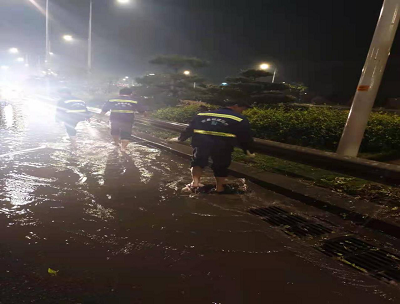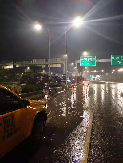 按照对9处养护道路设施采取24小时轮流值班的要求,保证每处设施有4人在不间断巡查,做到每隔30分钟汇报各设施路面积水情况,确保应急处理小组第一时间掌握各路段现场情况。由于祥云大道、沿江南大道部分路段积易水,则各配备6台抽水泵严阵以待,现场人员24小时蹲守,确保该2条设施路面无积水情况发生。由于强风暴雨天气造成乔灌木倒塌约35棵,我司管养运营部立即安排人员进行扶正加固,折断的则进行切割,后续进行更换补栽。