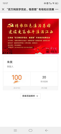 本次活动通过参与在线答题,题目共设20道,题型为单选和多项选择题,内容侧重习近平法治思想的核心要义、红色法治知识类,每道5分,共计100分。全体员工踊跃参与了此项答题活动,竞答率达100%。