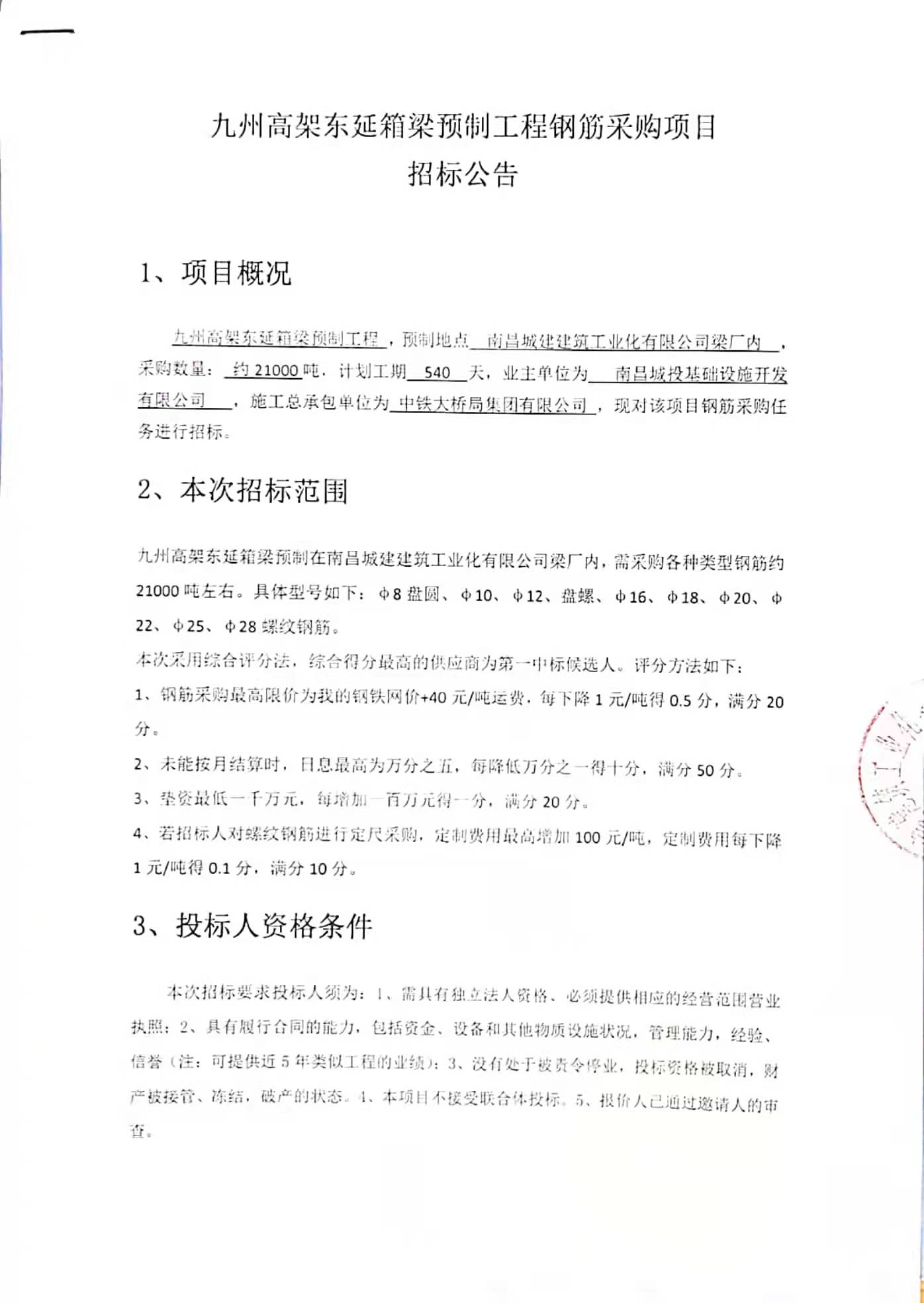九州高架东延箱梁预制工程 ,预制地点 永利yl23411建筑工业化有限公司梁厂内 ,采购数量: 约21000吨,计划工期 540 天,业主单位为 南昌城投基础设施开发有限公司 ,施工总承包单位为 中铁大桥局集团有限公司 ,现对该项目钢筋采购任务进行招标。