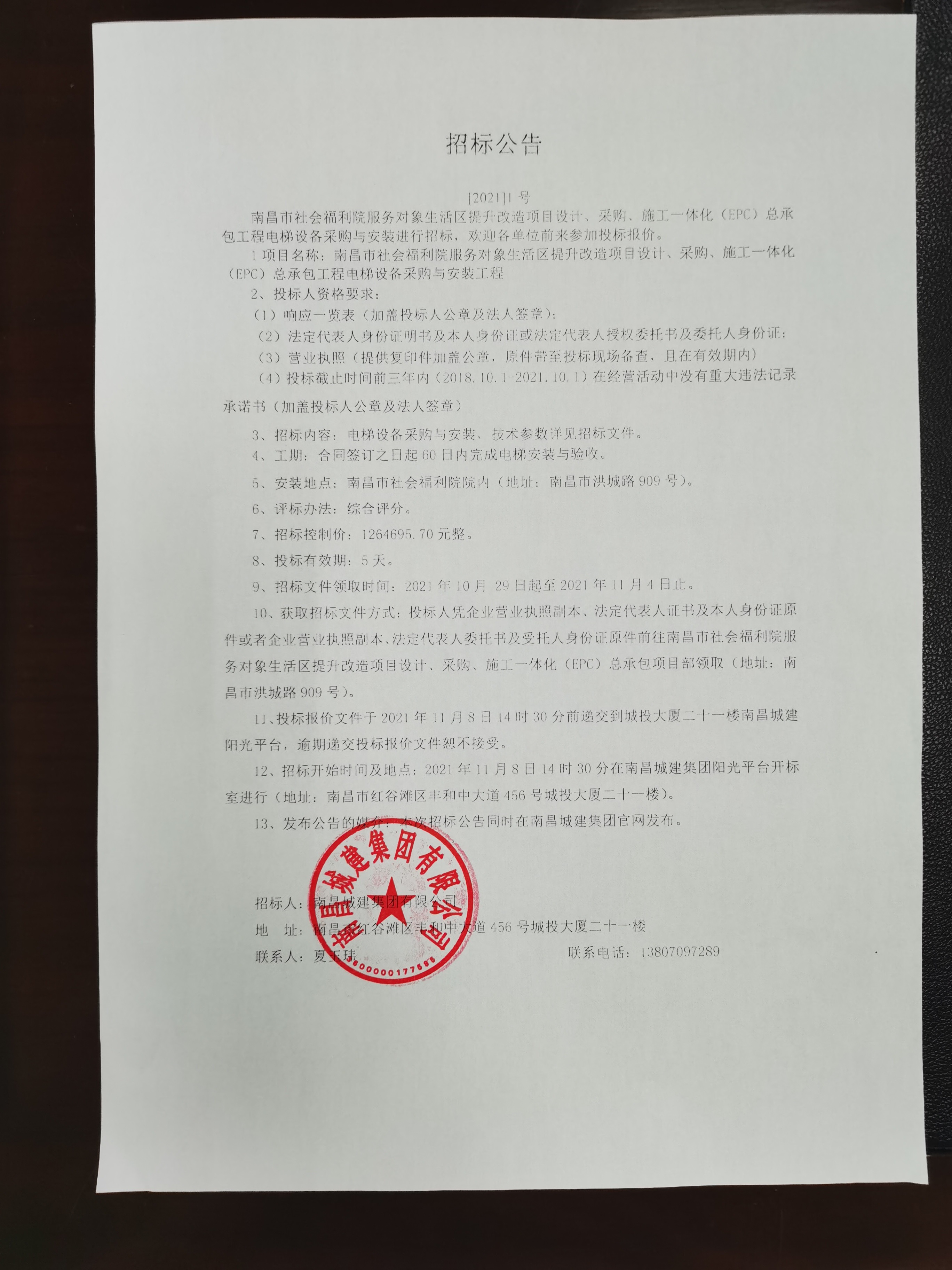 1、项目名称:南昌市社会福利院服务对象生活区提升改造项目设计、采购、施工一体化(EPC)总承包工程电梯设备采购与安装工程