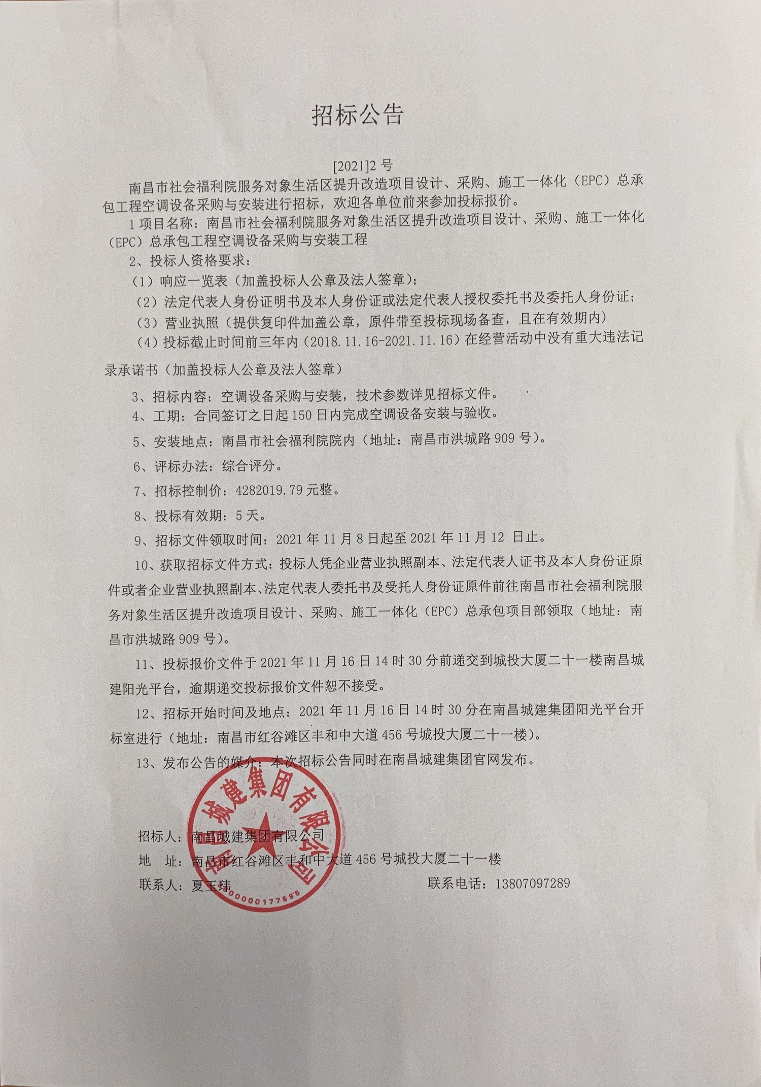 南昌市社会福利院服务对象生活区提升改造项目设计、采购、施工一体化(EPC)总承包工程空调设备采购与安装进行招标,欢迎各单位前来参加投标报价。
