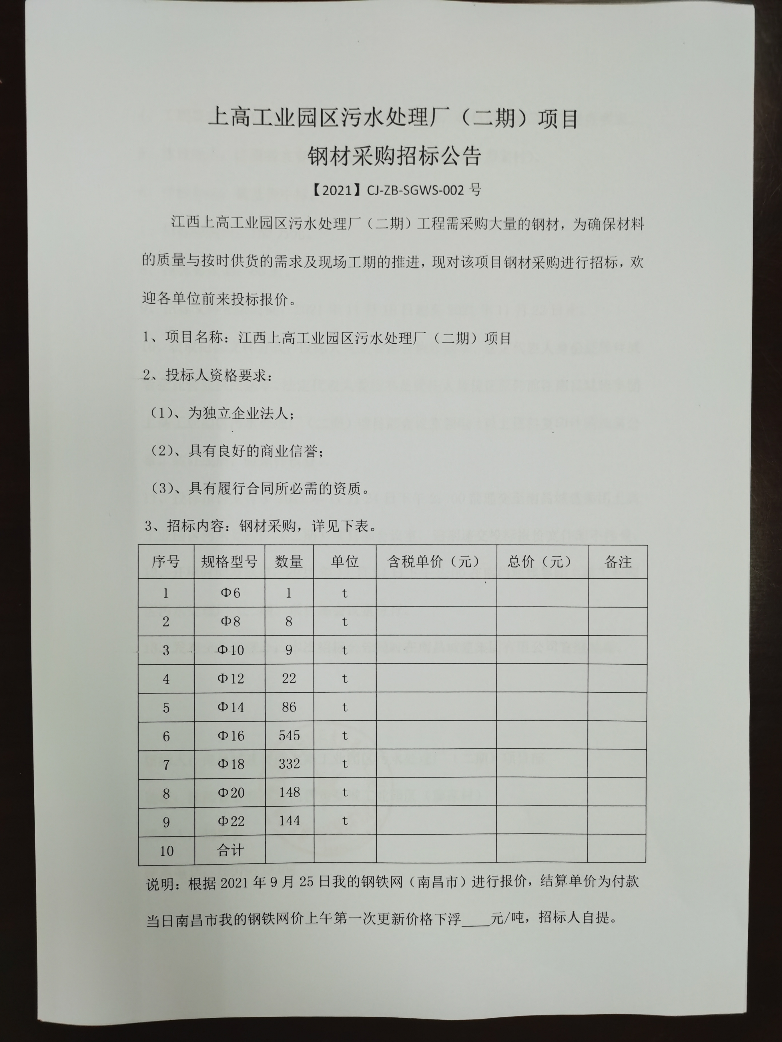 江西上高工业园区污水处理厂(二期)工程需采购大量的钢材,为确保材料的质量与按时供货的需求及现场工期的推进,现对该项目钢材采购进行招标,欢迎各单位前来投标报价。