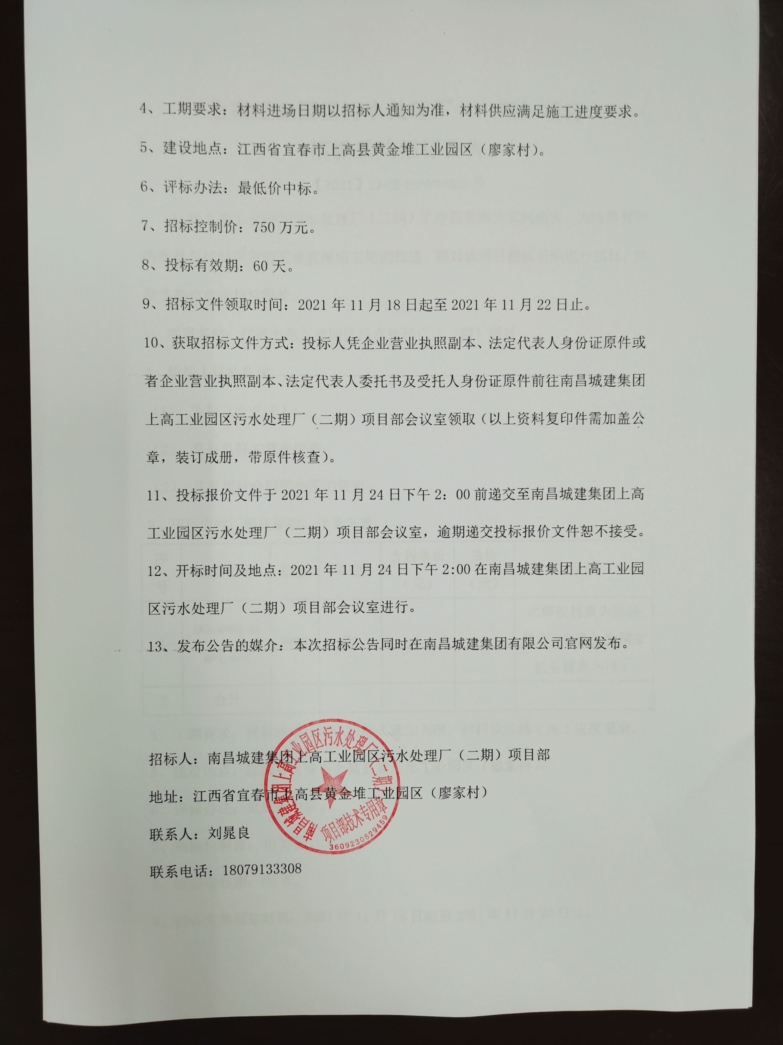 11、投标报价文件于2021年11月24日下午2:00前递交至永利yl23411集团上高工业园区污水处理厂(二期)项目部会议室,逾期递交投标报价文件恕不接受。