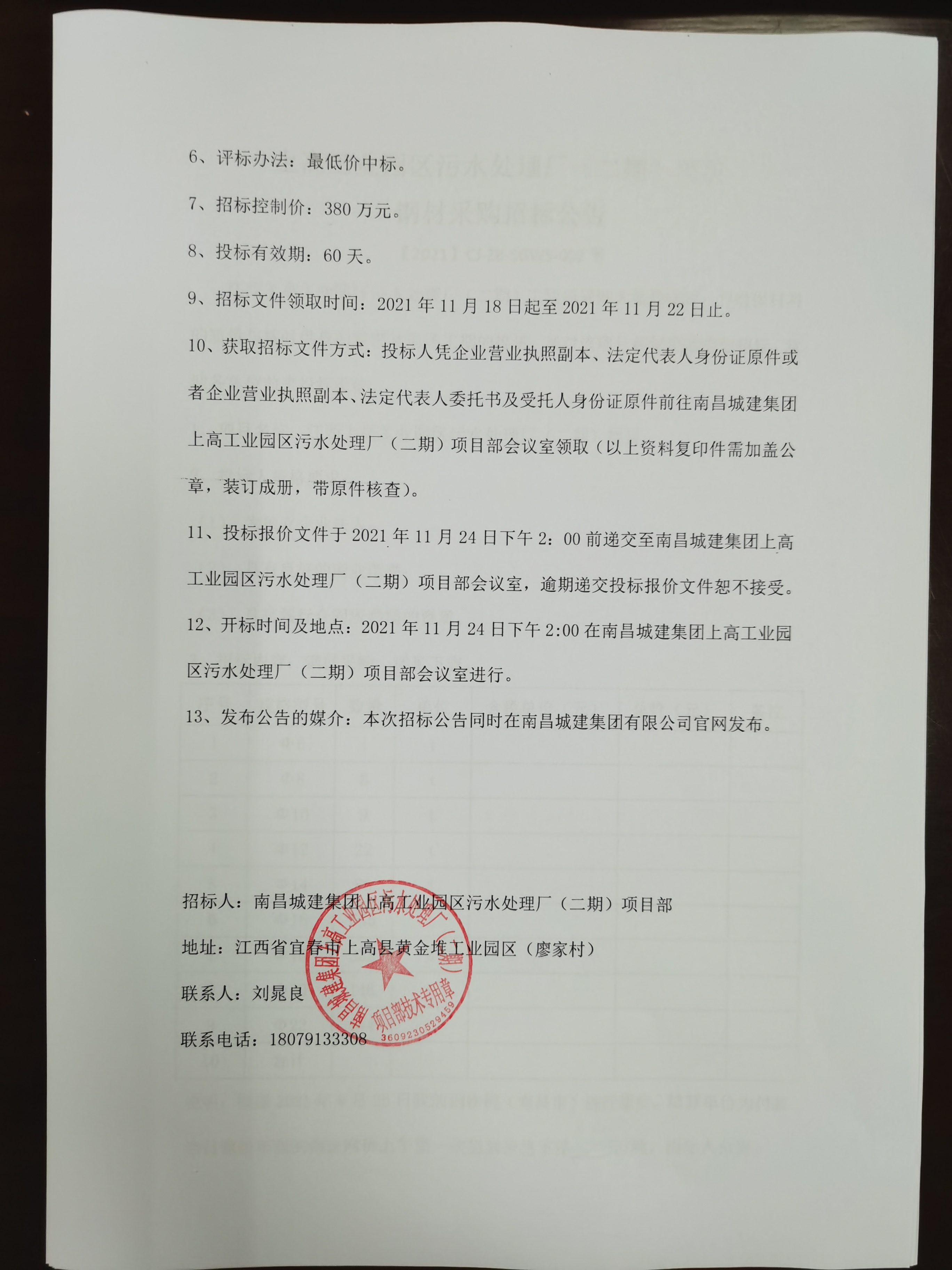 12、开标时间及地点:2021年11月24日下午2:00在永利yl23411集团上高工业园区污水处理厂(二期)项目部会议室进行。