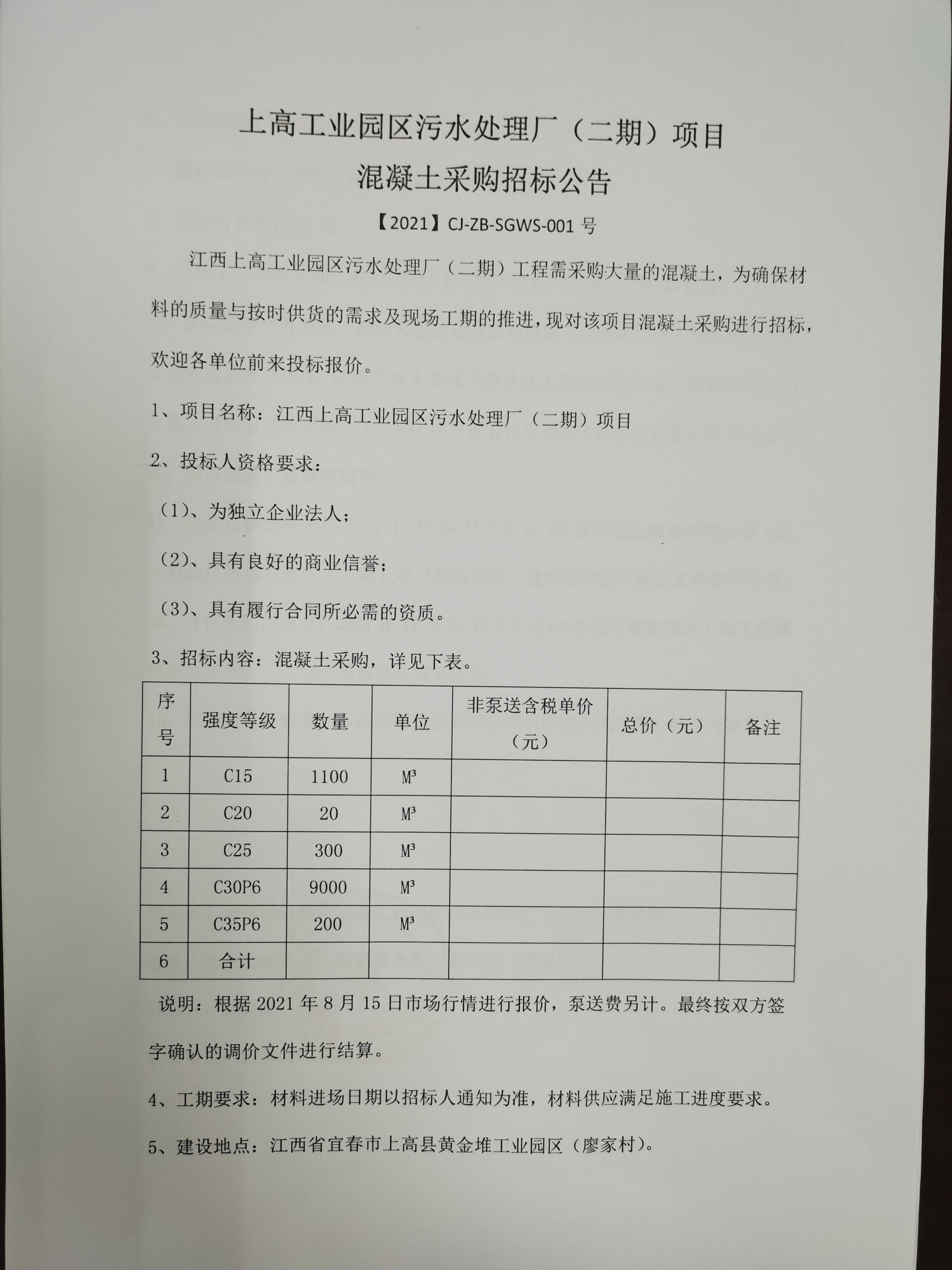 江西上高工业园区污水处理厂(二期)工程需采购大量的混凝土,为确保材料的质量与按时供货的需求及现场工期的推进,现对该项目混凝土采购进行招标,欢迎各单位前来投标报价。