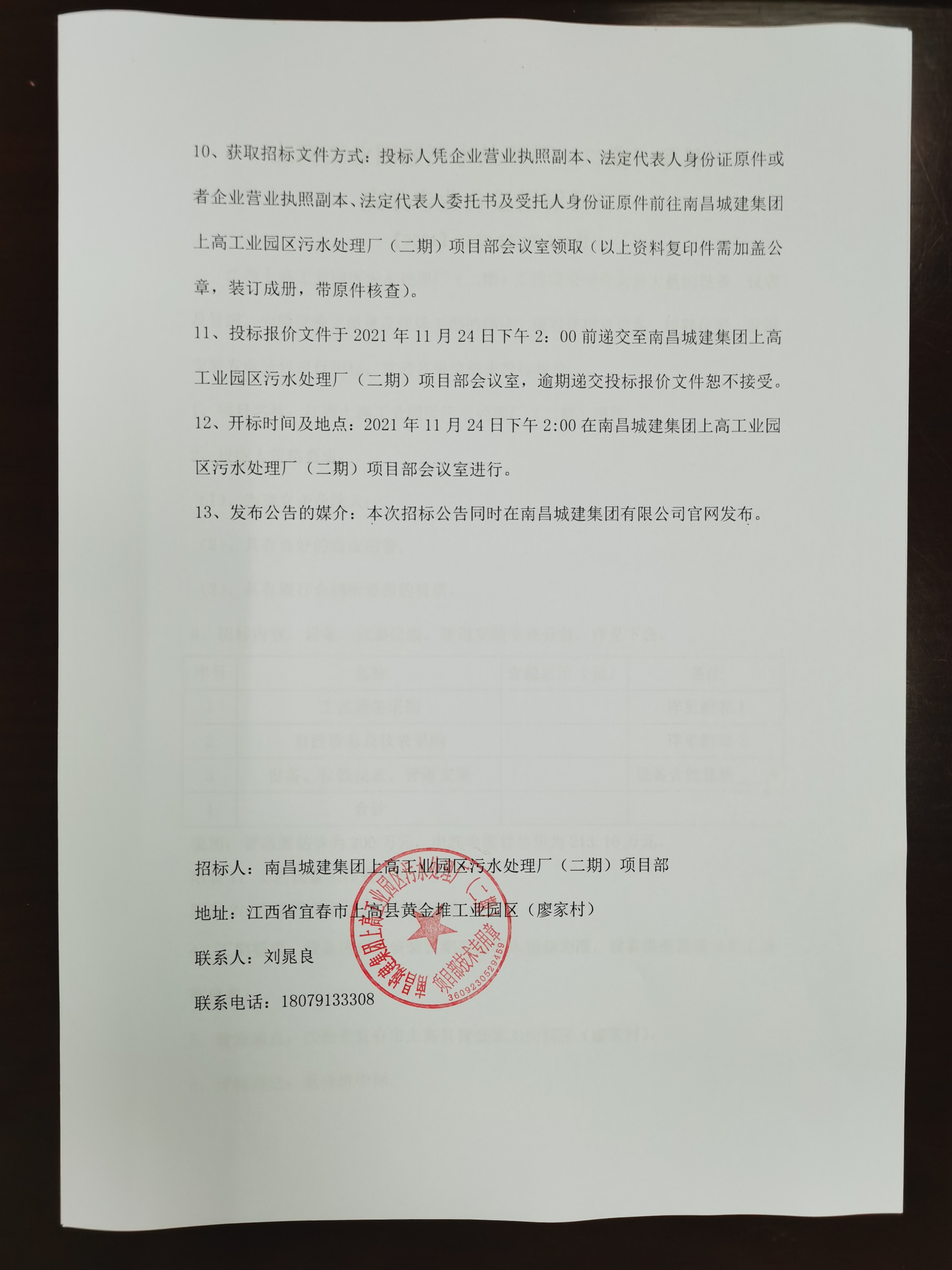 12、开标时间及地点:2021年11月24日下午2:00在永利yl23411集团上高工业园区污水处理厂(二期)项目部会议室进行。