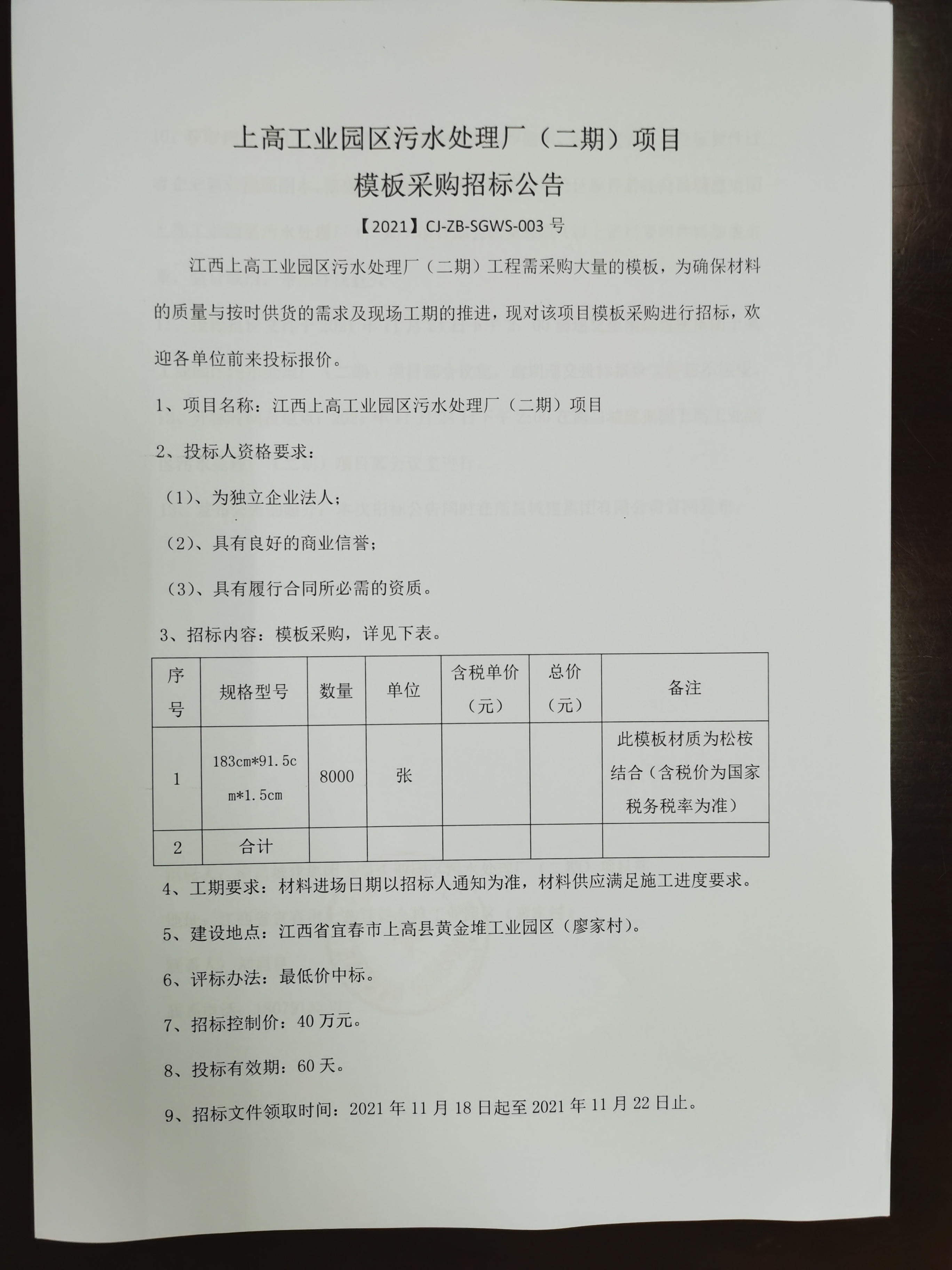 江西上高工业园区污水处理厂(二期)工程需采购大量的模板,为确保材料的质量与按时供货的需求及现场工期的推进,现对该项目模板采购进行招标,欢迎各单位前来投标报价。