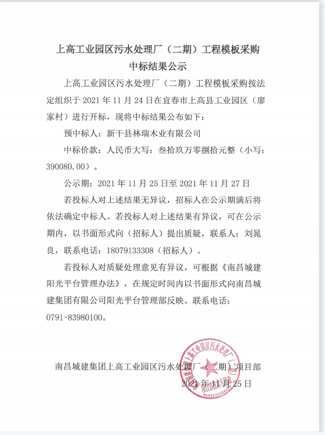 上高工业园区污水处理厂(二期)工程模板采购按法定组织于2021年11月24日在宜春市上高县上高工业园区(廖家村)进行开标,现将中标结果公布如下: