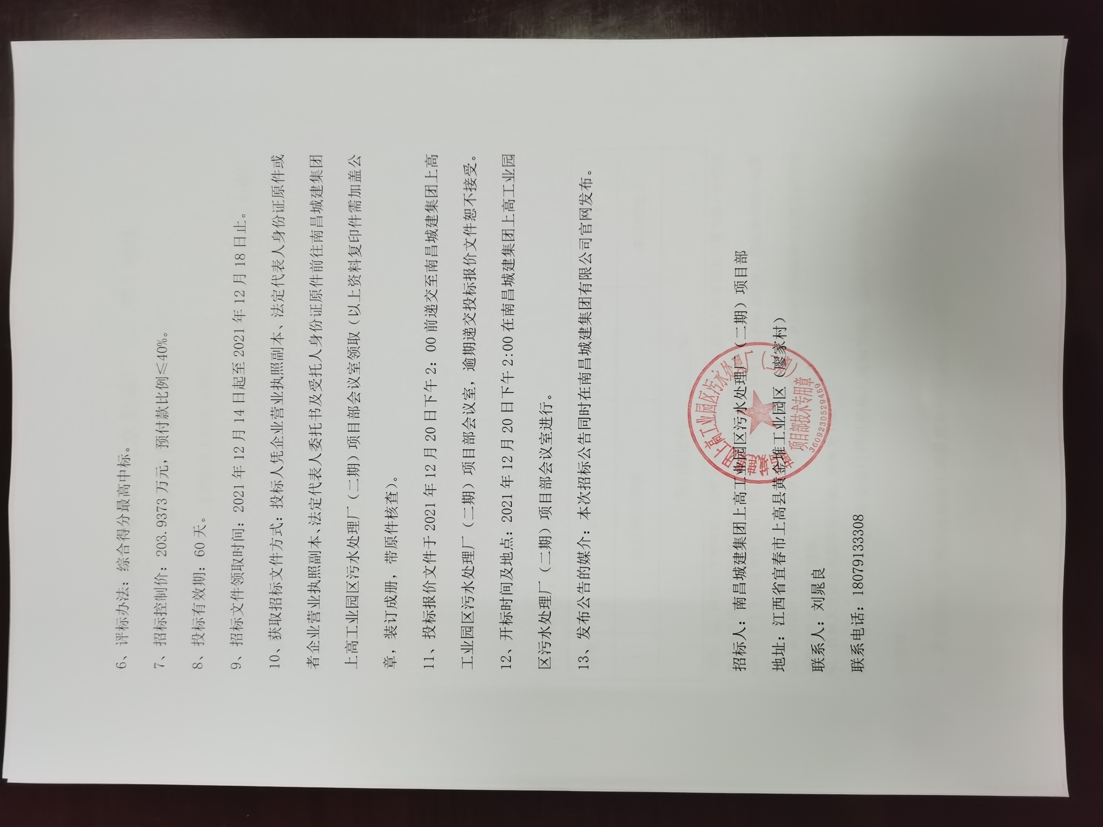 11、投标报价文件于2021年12月20日下午2:00前递交至永利yl23411集团上高工业园区污水处理厂(二期)项目部会议室,逾期递交投标报价文件恕不接受。