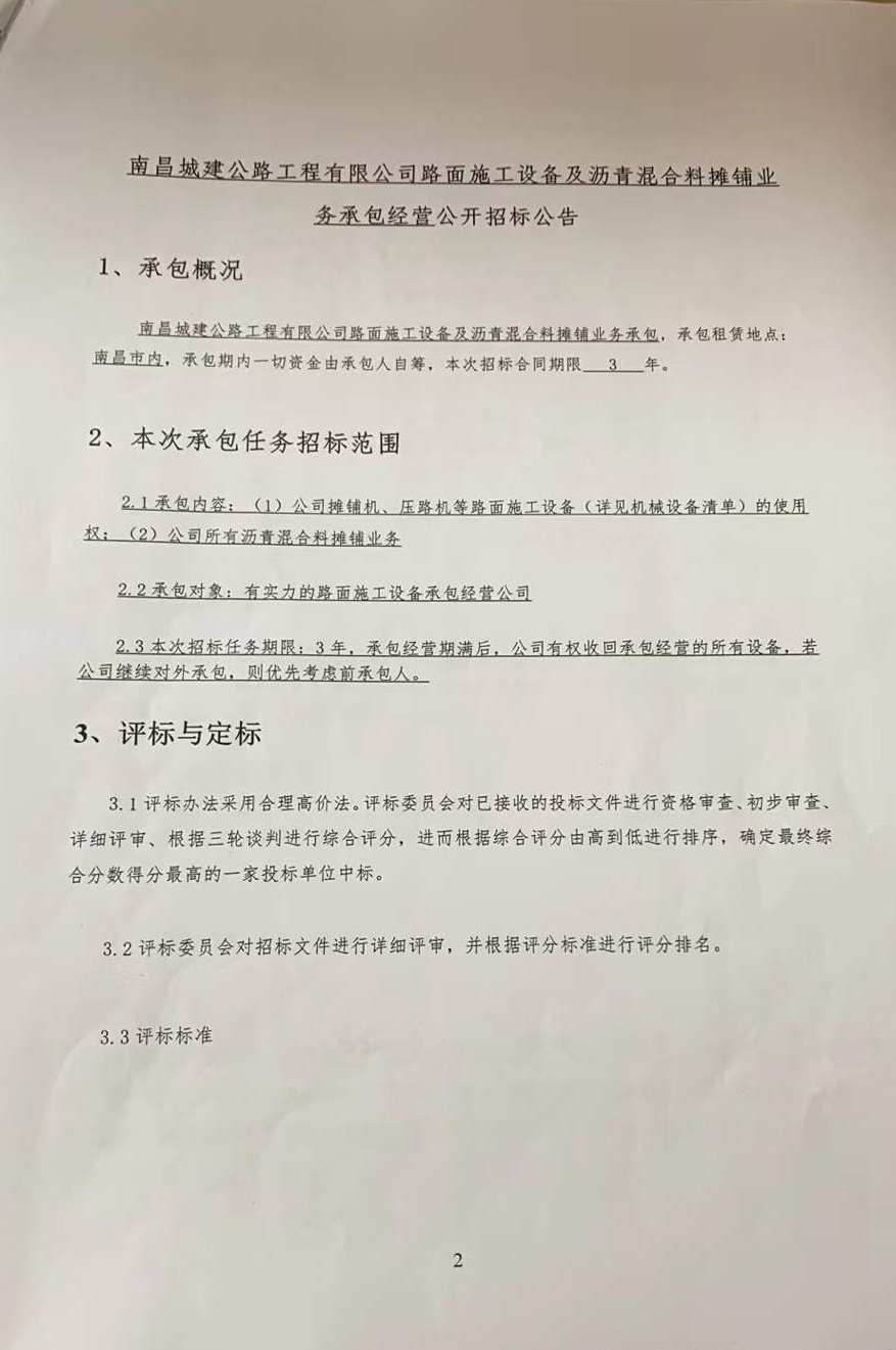 永利yl23411公路工程有限公司路面施工设备及沥青混合料摊铺业务承包,承包租赁地点:南昌市内,承包期内一切资金由承包人自筹,本次招标合同期限 3 年。