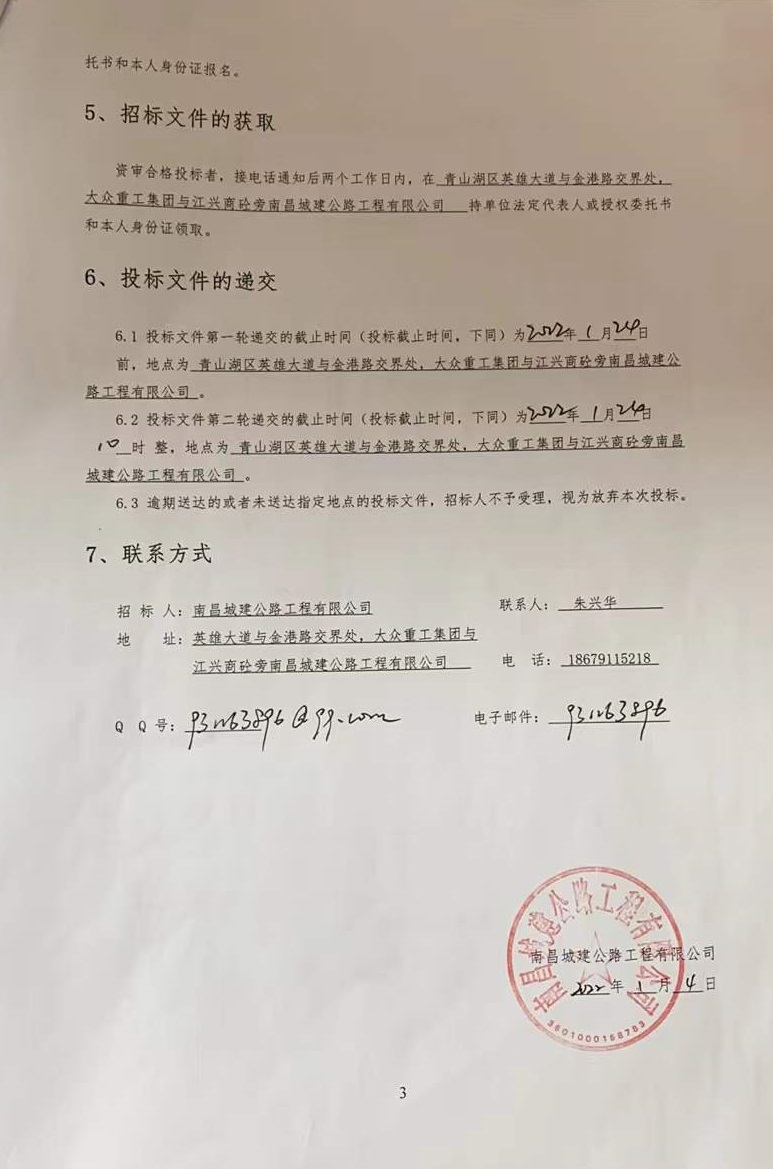 资审合格投标者,接电话通知后两个工作日内,在 青山湖区英雄大道与金港路交界处,大众重工集团与江兴商砼旁永利yl23411公路工程有限公司 持单位法定代表人或授权委托书和本人身份证领取。