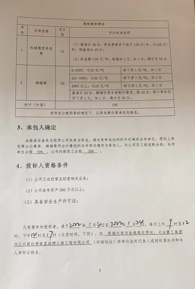 由路面设备承包租赁公司来参与承包,通过竞争性谈判的方式确定合作单位,原则上承包费出价最高、摊铺费用出价最低的合作单位确定为承包人,与公司员工组成联合体,合作单位占股 70% ,公司内部员工占股 30% 。