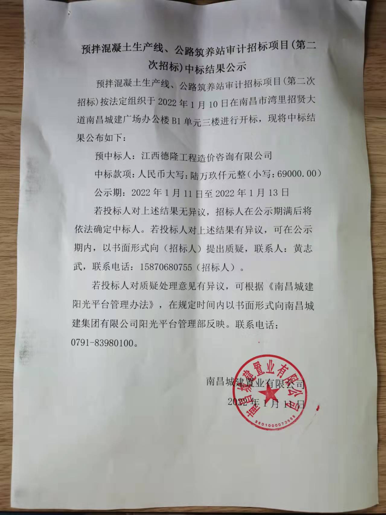 预拌混凝土生产线、公路筑养站审计招标项目(第二次招标)按法定组织于2022年1月10日在南昌市湾里招贤大道永利yl23411广场办公楼B1单元三楼进行开标,现将中标结果公布如下: