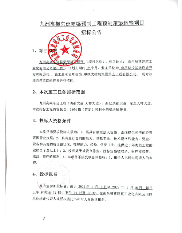 九洲高架东延箱梁预制工程预 (项目名称),项目地点: 永利yl23411建筑工业化有限公司梁厂内 ,计划工期约12个月,业主单位为 南昌城投基础设施开发有限公司 ,施工总承包单位为 中铁大桥局集团第五工程有限公司 ,现对该项目箱梁运输任务进行招标。