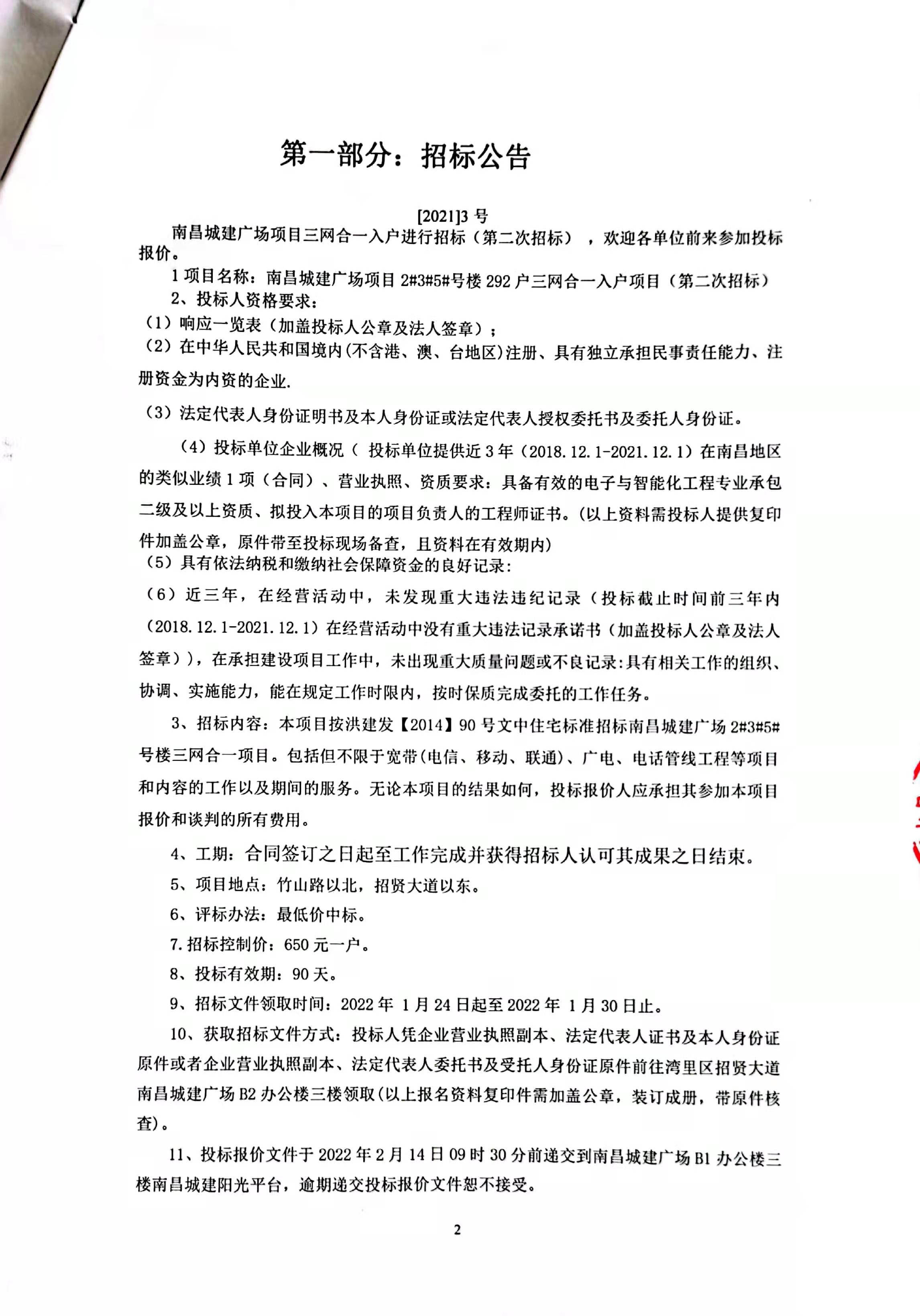 1、项目名称:永利yl23411广场项目2#3#5#号楼292户三网合一入户项目(第二次招标)