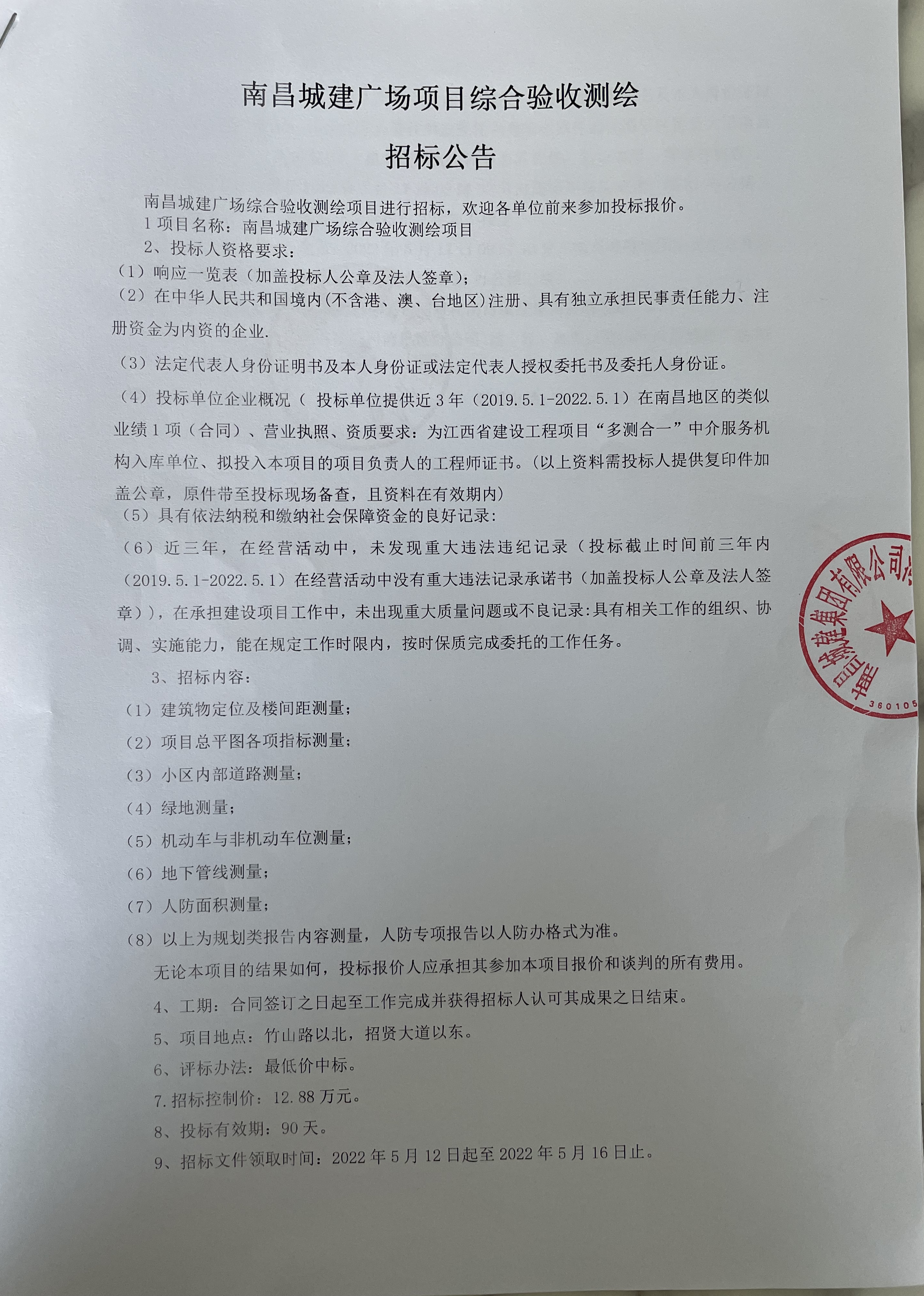 永利yl23411广场综合验收测绘项目进行招标,欢迎各单位前来参加投标报价。