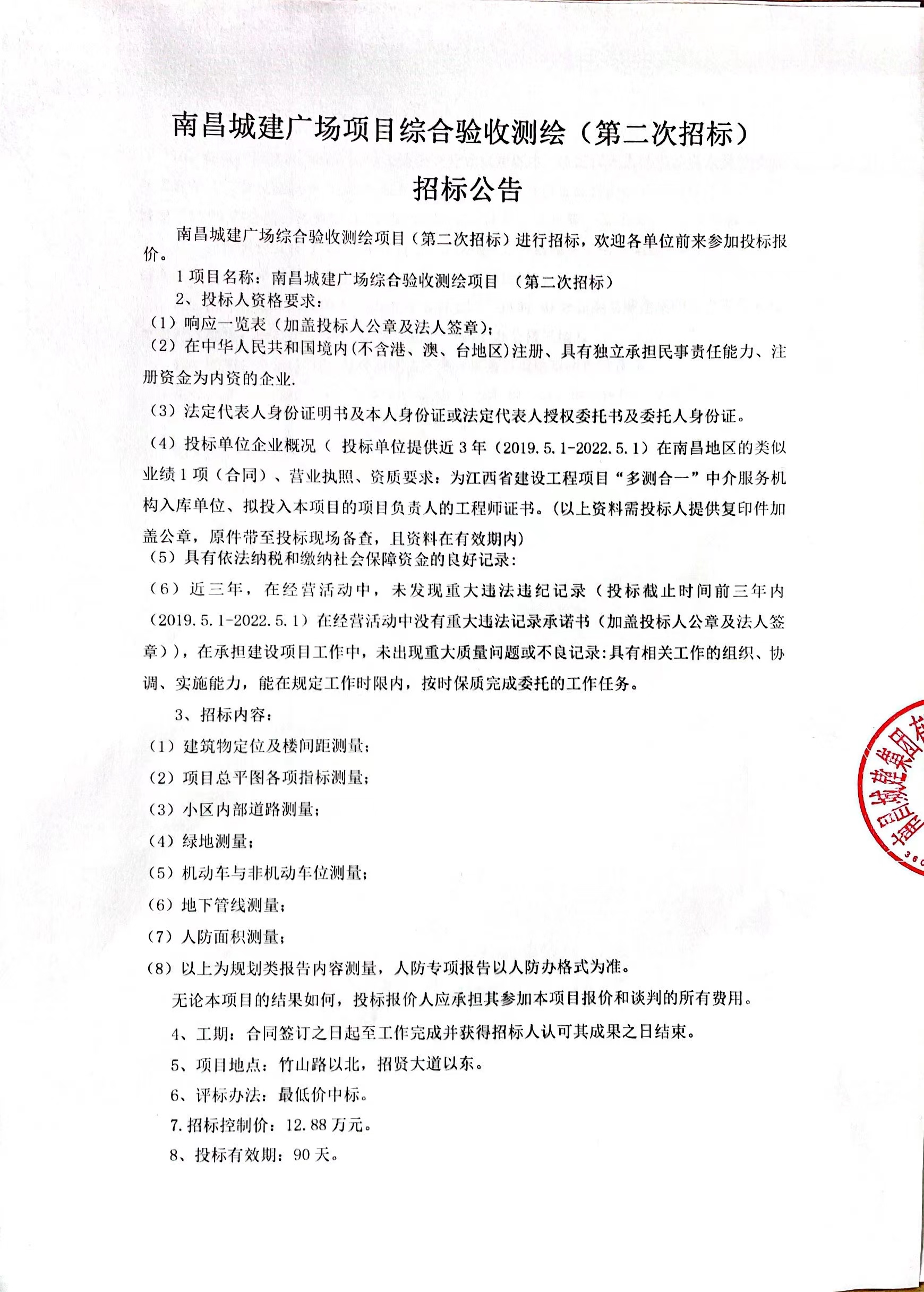 永利yl23411广场综合验收测绘项目(第二次招标)进行招标,欢迎各单位前来参加投标报价。