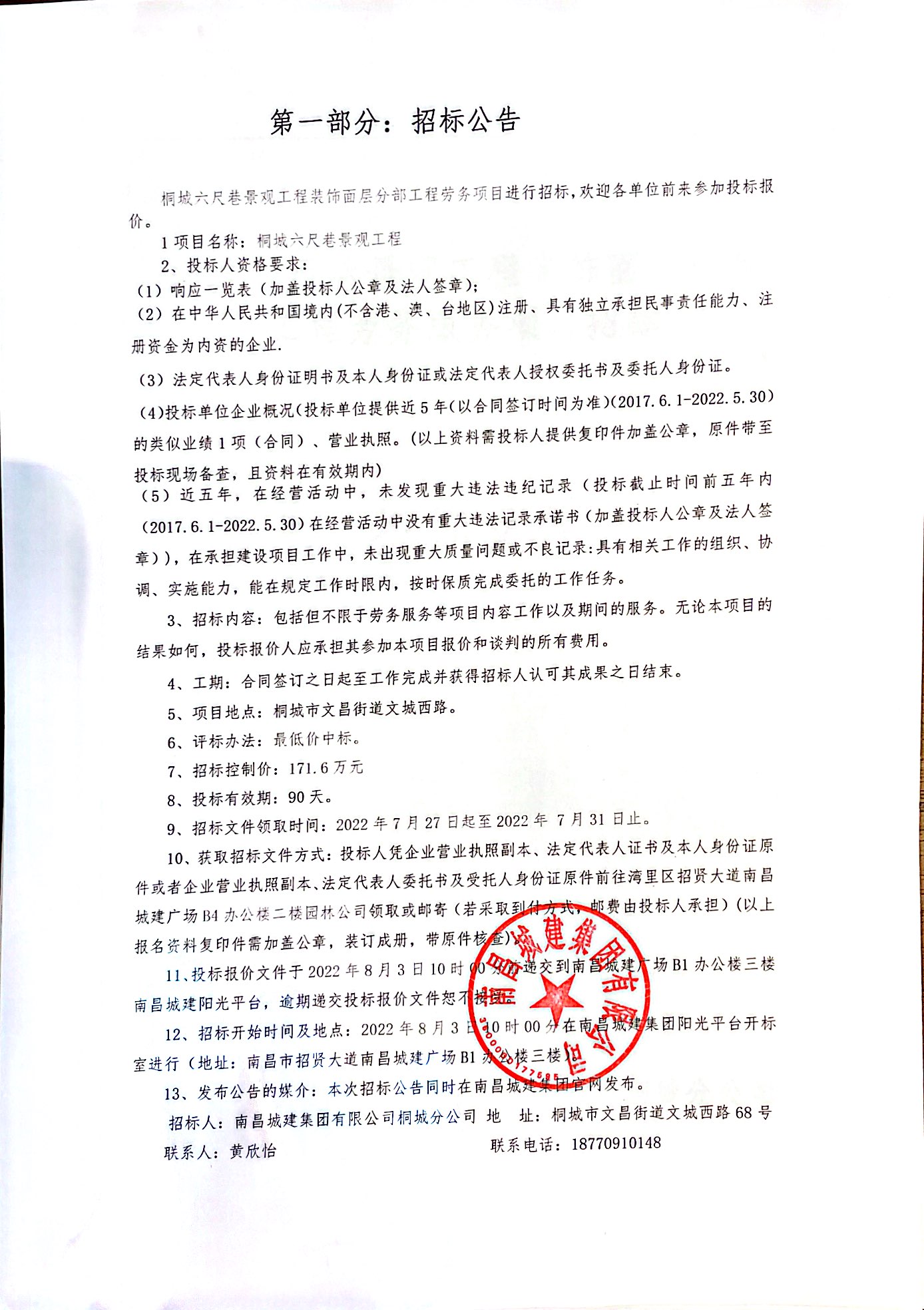 桐城六尺巷景观工程装饰面层分部工程劳务项目进行招标,欢迎各单位前来参加投标报价。