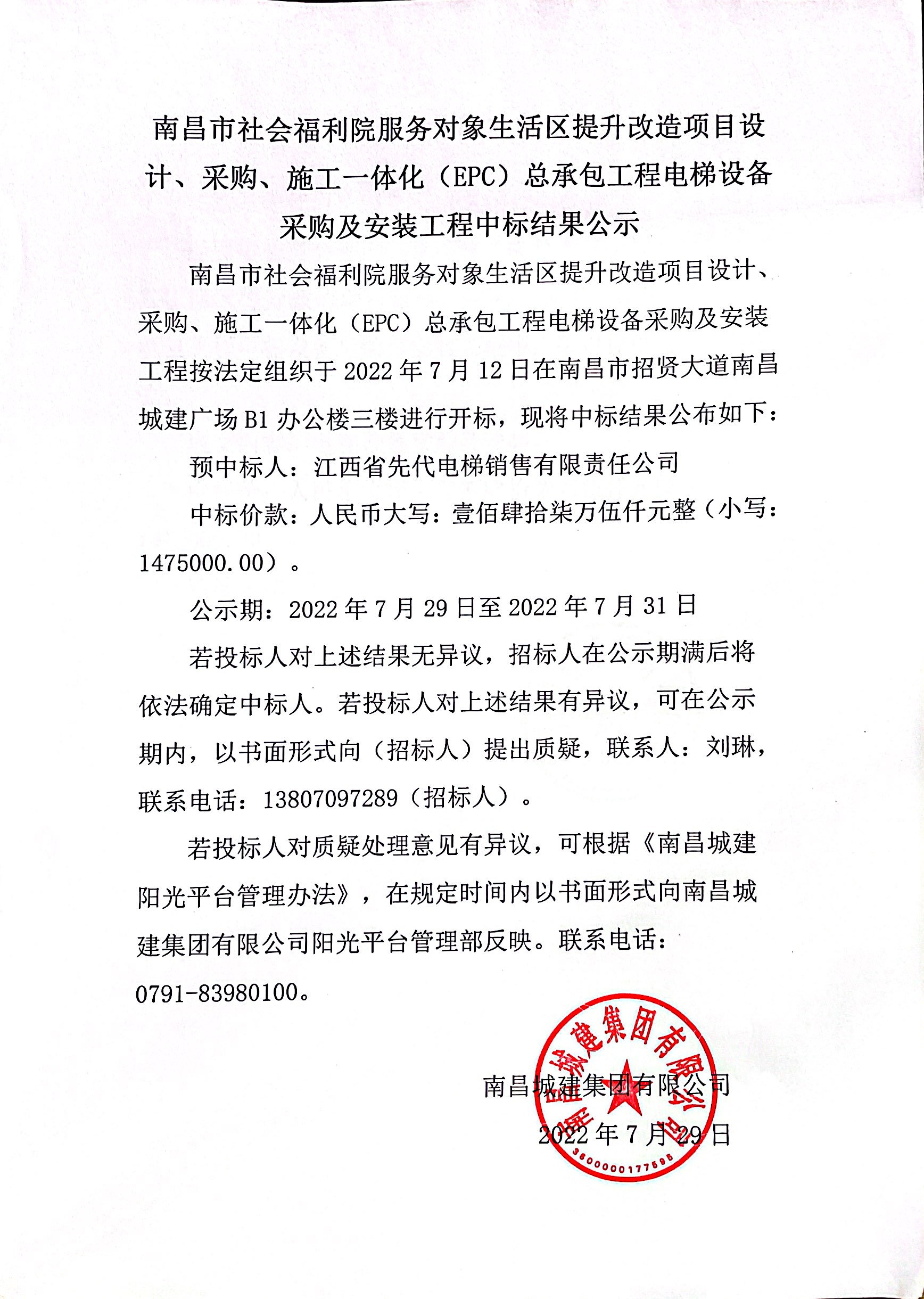 南昌市社会福利院服务对象生活区提升改造项目设计、采购、施工一体化(EPC)总承包工程电梯设备采购及安装工程按法定组织于2022年7月12日在南昌市招贤大道永利yl23411广场B1办公楼三楼进行开标,现将中标结果公布如下: