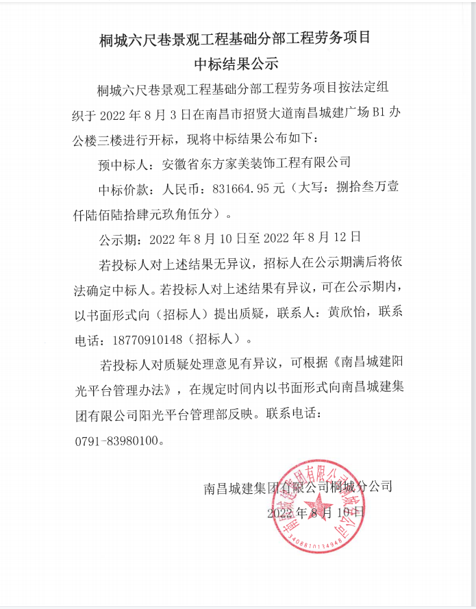 桐城六尺巷景观工程基础分部工程劳务项目按法定组织于2022年8月3日在南昌市招贤大道永利yl23411广场B1办公楼三楼进行开标,现将中标结果公布如下: