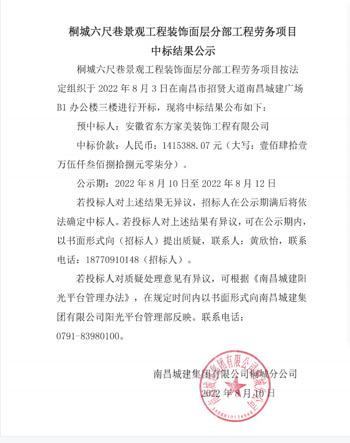 桐城六尺巷景观工程装饰面层分部工程劳务项目按法定组织于2022年8月3日在南昌市招贤大道永利yl23411广场B1办公楼三楼进行开标,现将中标结果公布如下: