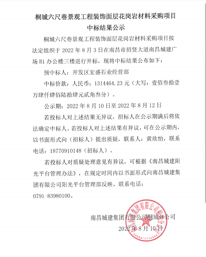 桐城六尺巷景观工程装饰面层花岗岩材料采购项目按法定组织于2022年8月3日在南昌市招贤大道永利yl23411广场B1办公楼三楼进行开标,现将中标结果公布如下: