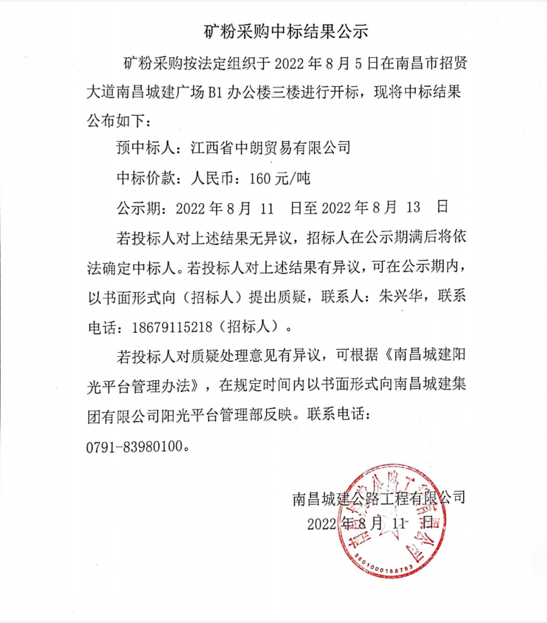 矿粉采购按法定组织于2022年8月5日在南昌市招贤大道永利yl23411广场B1办公楼三楼进行开标,现将中标结果公布如下: