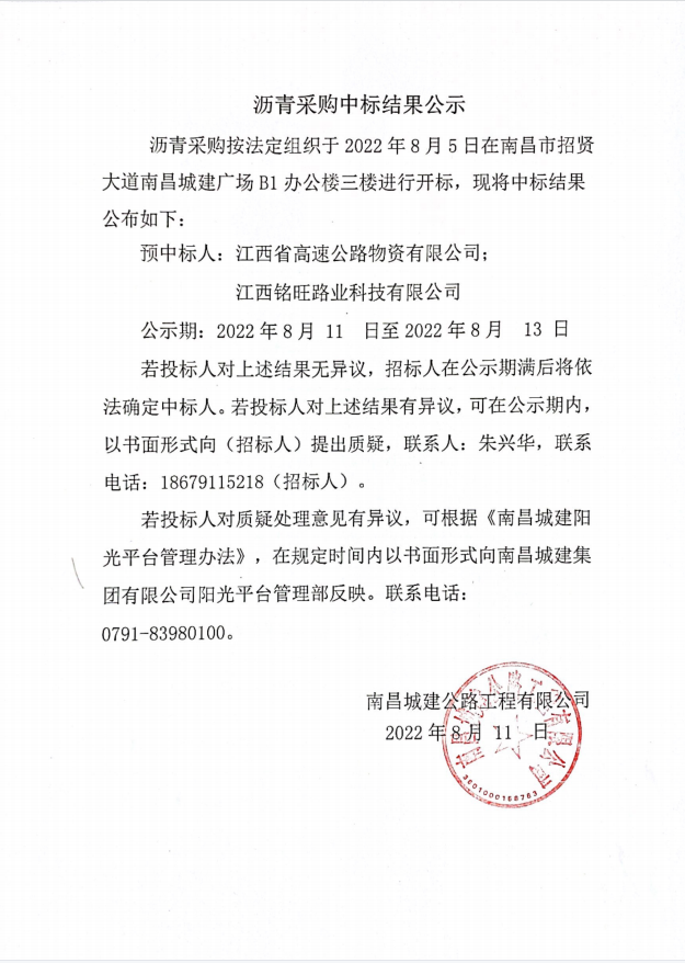 沥青采购按法定组织于2022年8月5日在南昌市招贤大道永利yl23411广场B1办公楼三楼进行开标,现将中标结果公布如下: