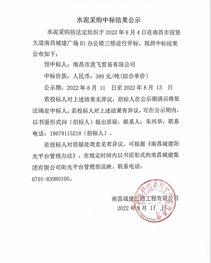 水泥采购按法定组织于2022年8月4日在南昌市招贤大道永利yl23411广场B1办公楼三楼进行开标,现将中标结果公布如下: