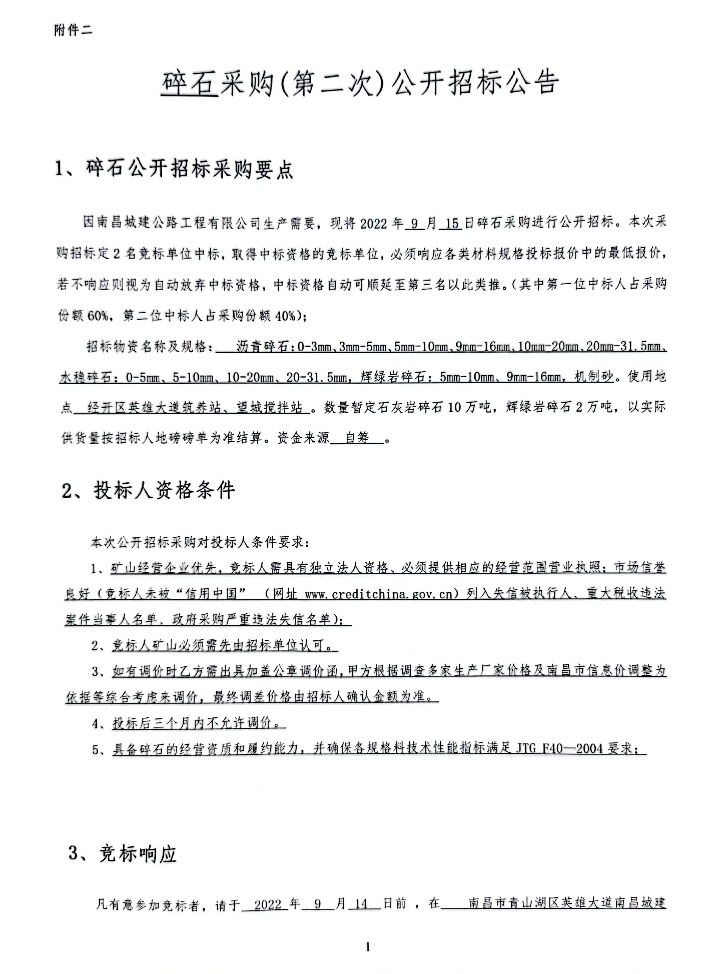 因永利yl23411公路工程有限公司生产需要,现将2022年 9 月 15日碎石采购进行公开招标。本次采购招标定2名竞标单位中标,取得中标资格的竞标单位,必须响应各类材料规格投标报价中的最低报价,若不响应则视为自动放弃中标资格,中标资格自动可顺延至第三名以此类推。(其中第一位中标人占采购份额60%,第二位中标人占采购份额40%);