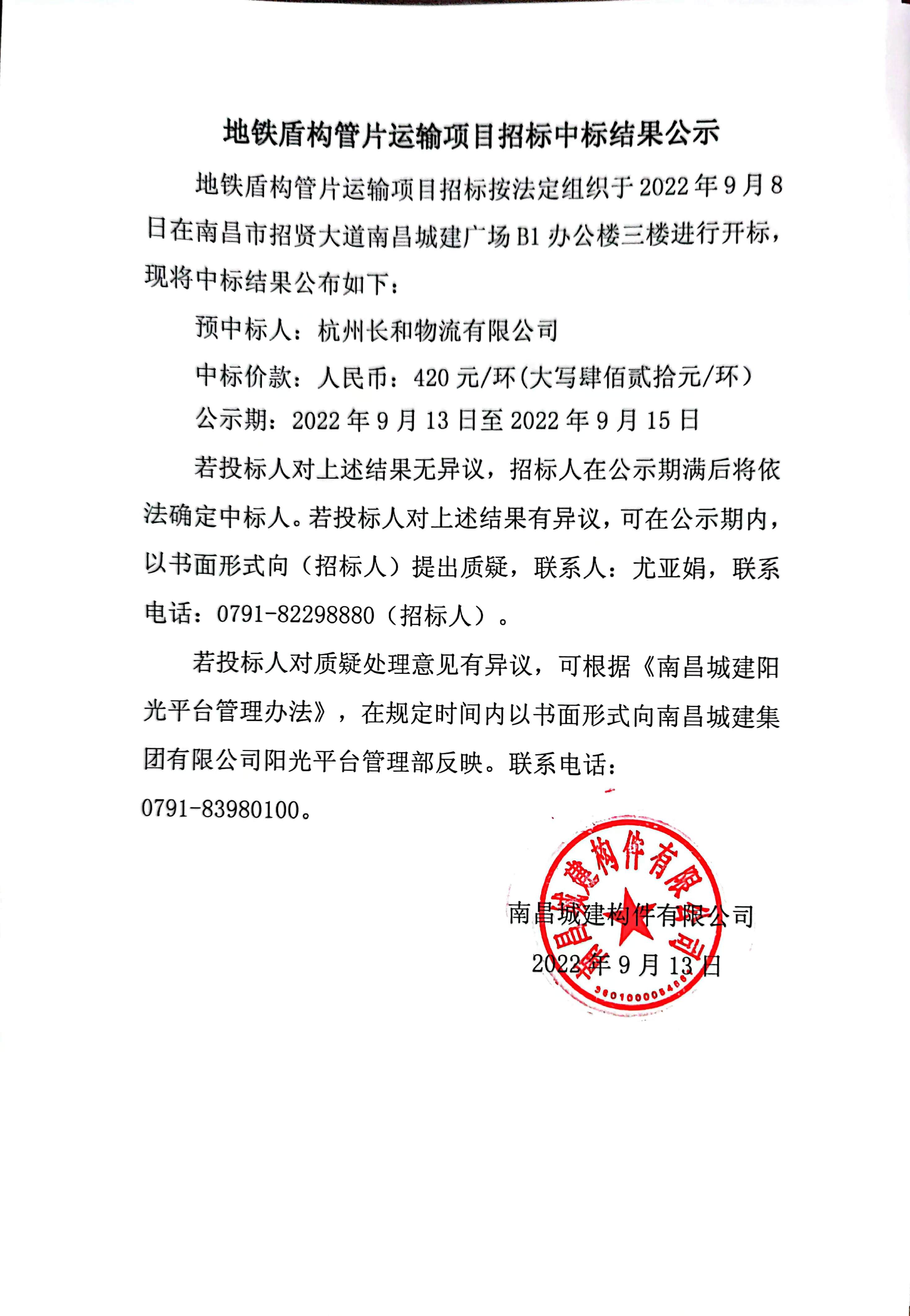 地铁盾构管片运输项目招标按法定组织于2022年9月8日在南昌市招贤大道永利yl23411广场B1办公楼三楼进行开标,现将中标结果公布如下: