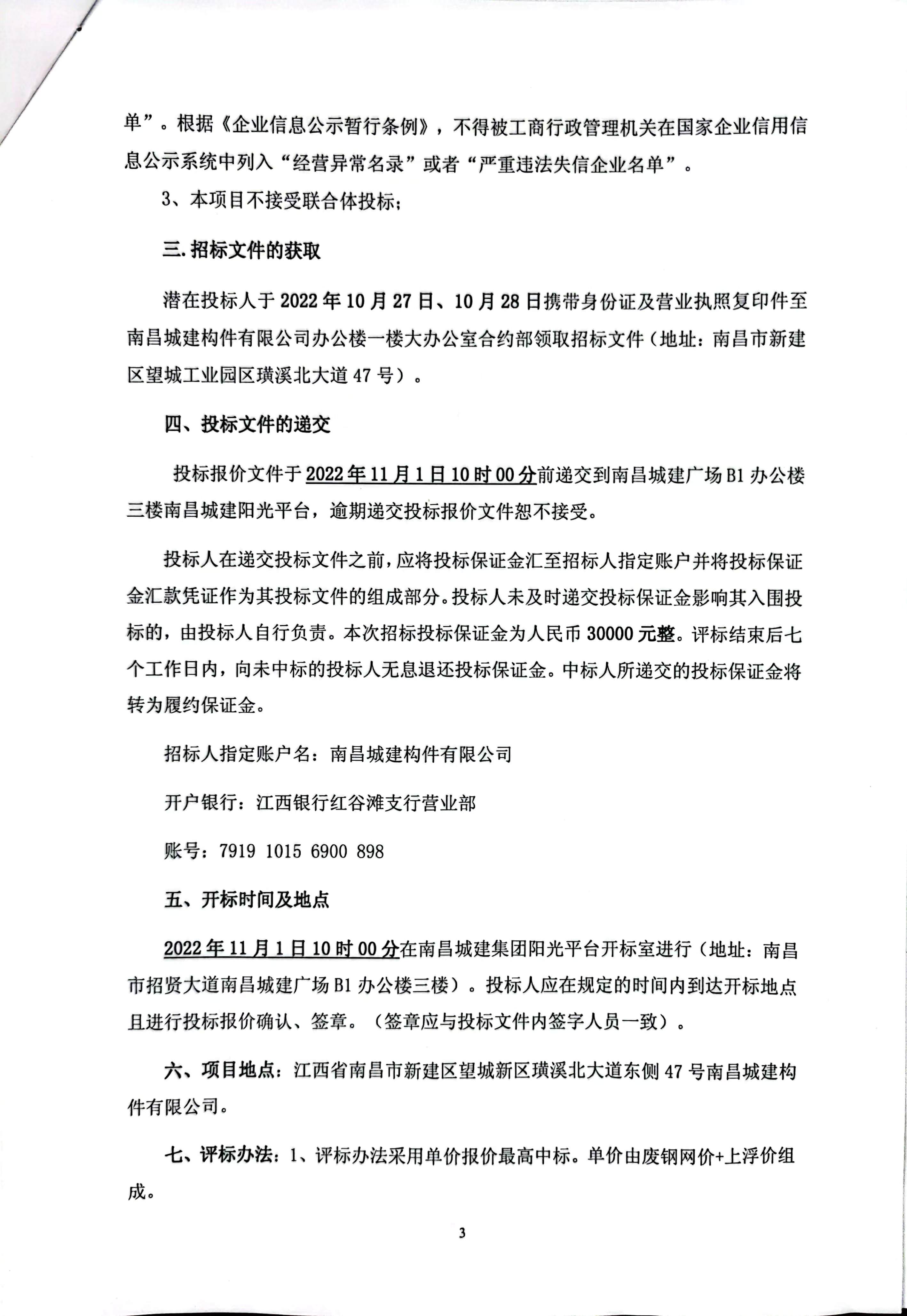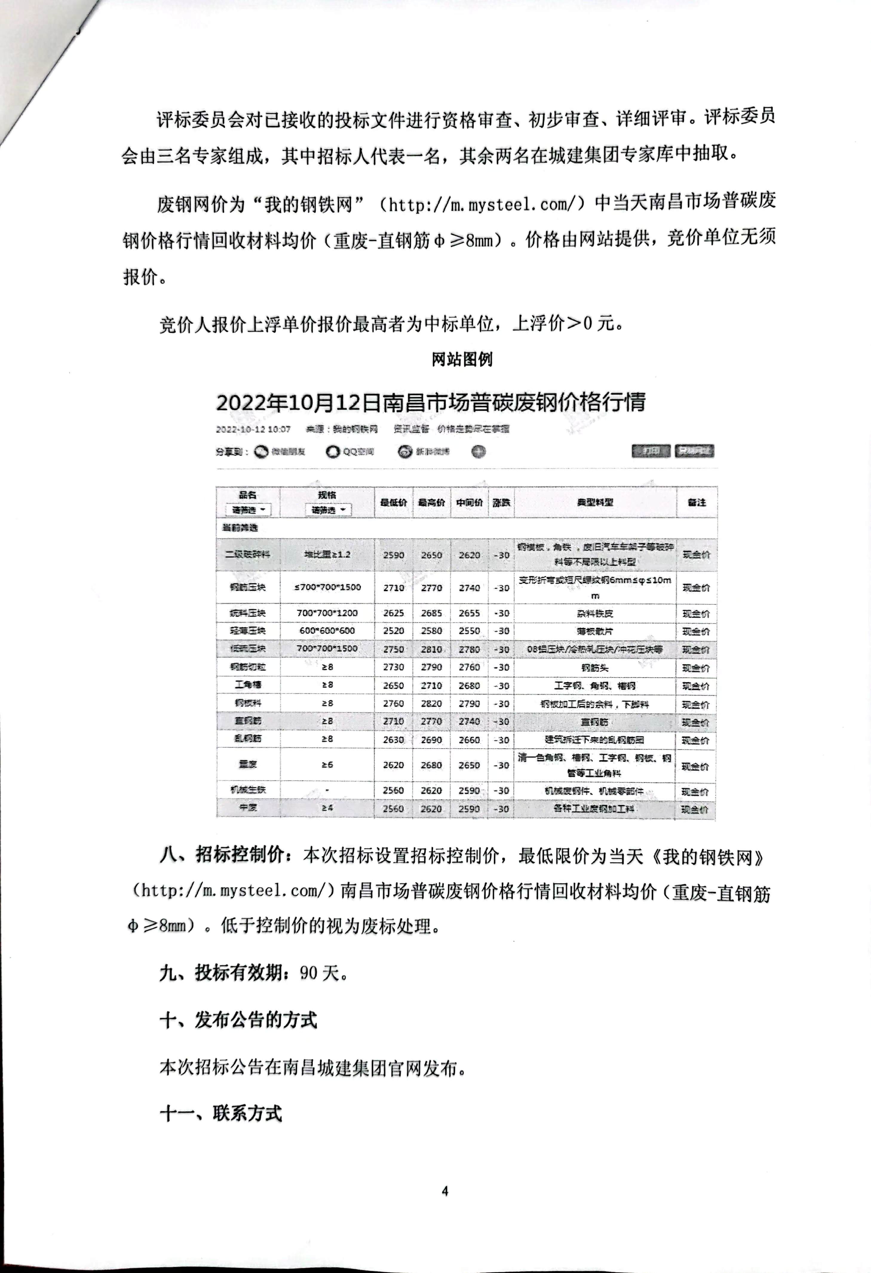 八、招标控制价:本次招标设置招标控制价,最低限价为当天《我的钢铁网》(http://m.mysteel.com/)南昌市场普碳废钢价格行情回收材料均价(重废-直钢筋φ≥8mm)。低于控制价的视为废标处理。