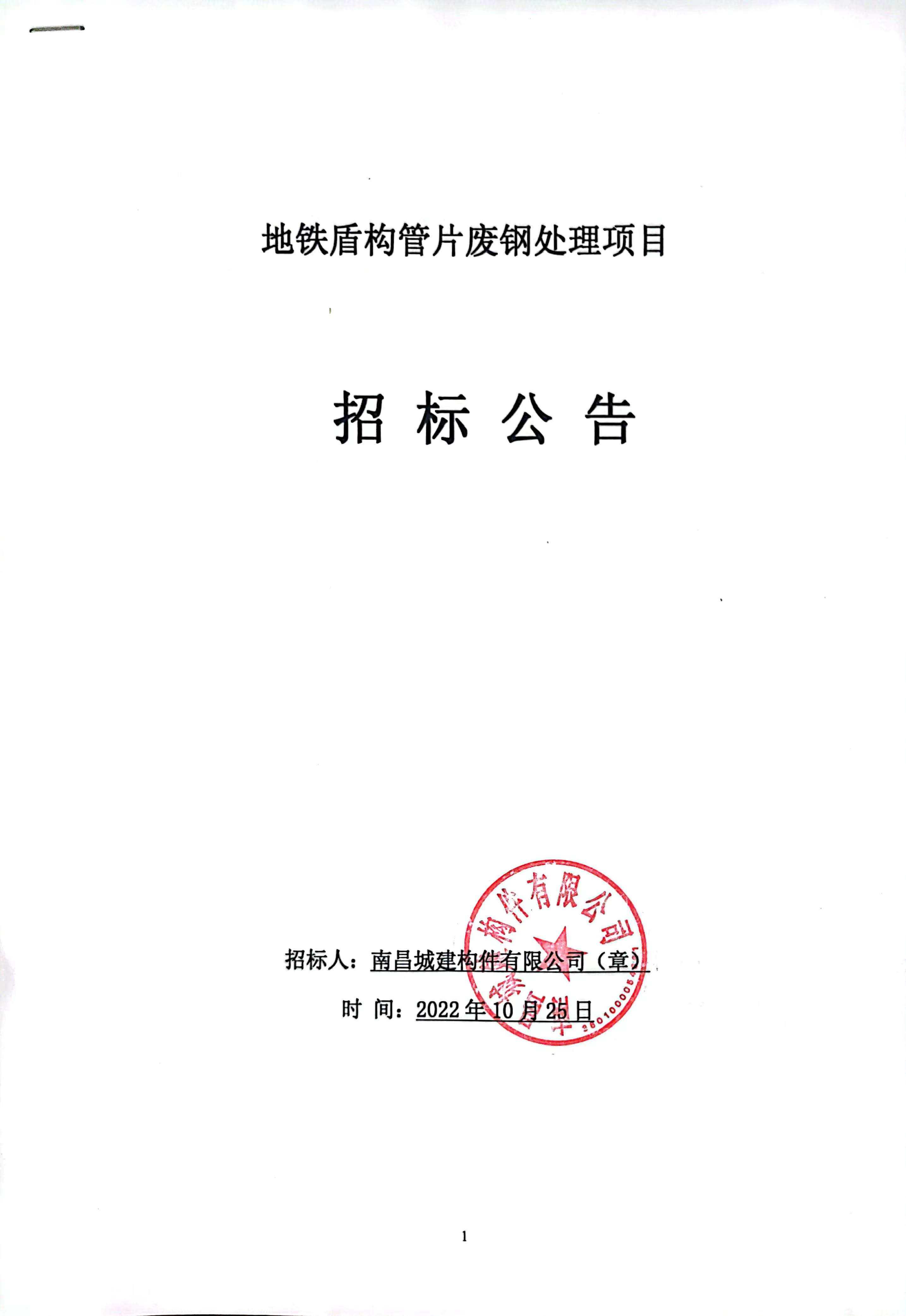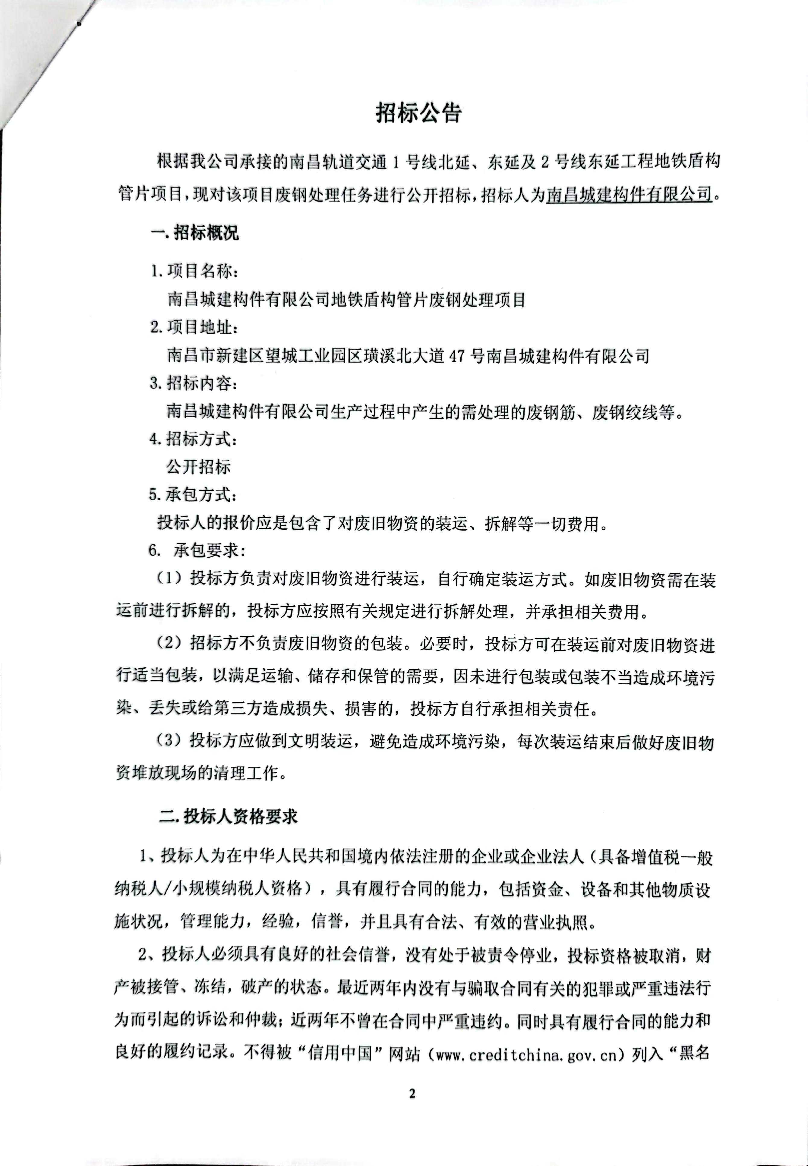 根据我公司承接的南昌轨道交通1号线北延、东延及2号线东延工程地铁盾构管片项目,现对该项目废钢处理任务进行公开招标,招标人为永利yl23411构件有限公司。