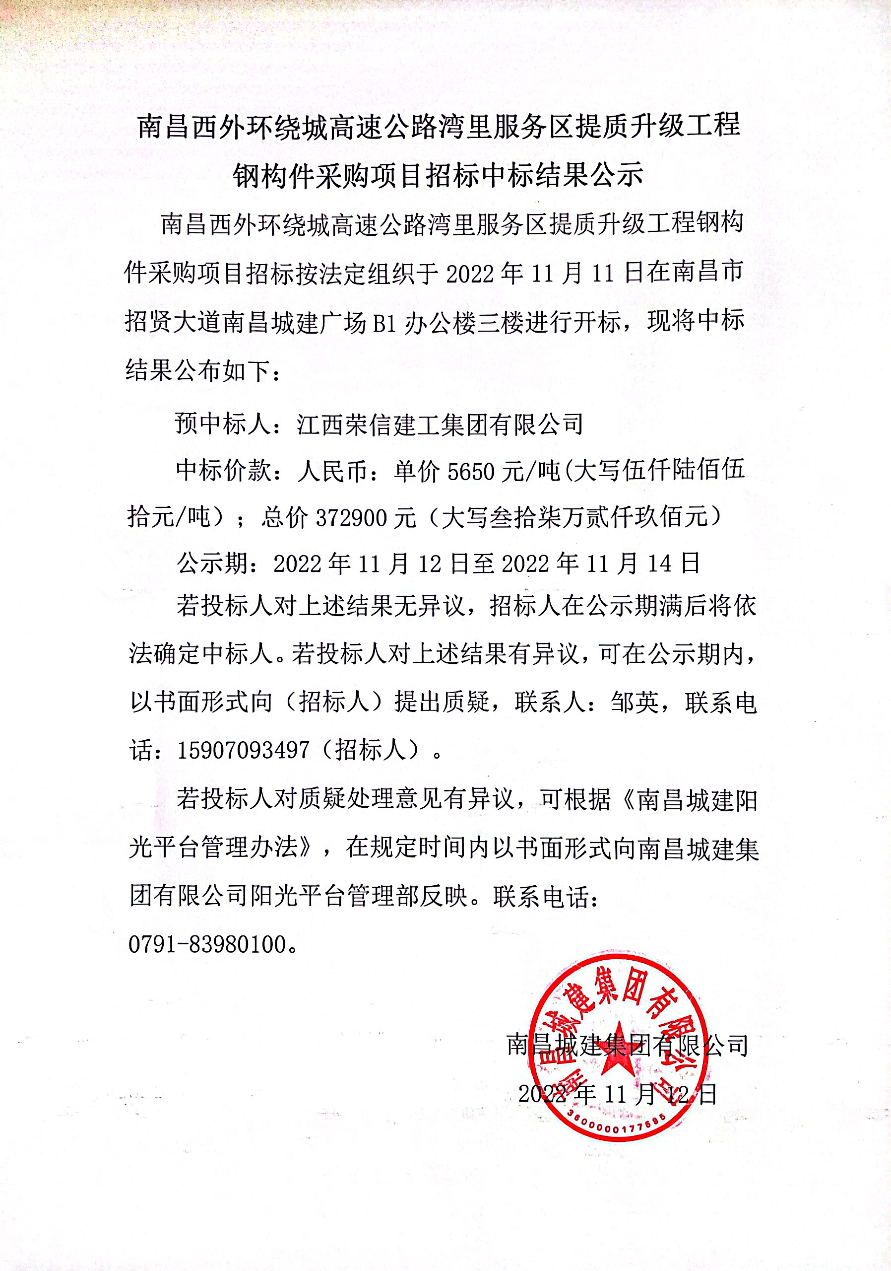 南昌西外环绕城高速公路湾里服务区提质升级工程钢构件采购项目招标按法定组织于2022年11月11日在南昌市招贤大道永利yl23411广场B1办公楼三楼进行开标,现将中标结果公布如下: