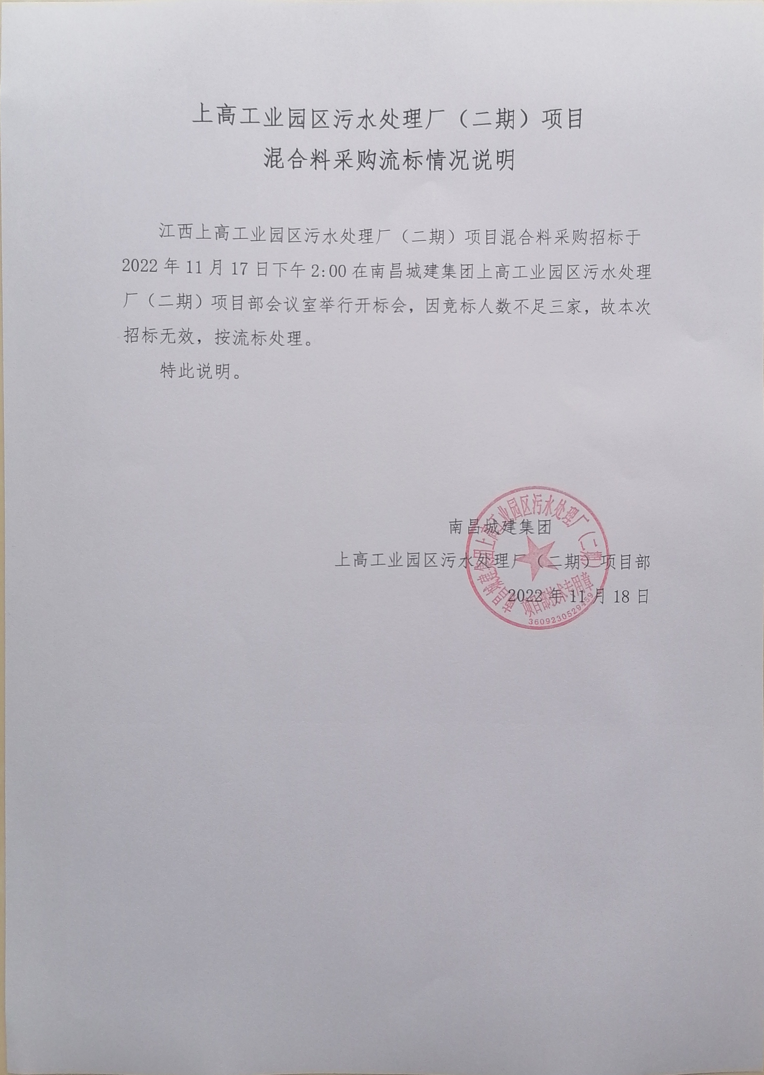 江西上高工业园区污水处理厂(二期)项目混合料采购招标于2022年11月17日下午2:00在永利yl23411集团上高工业园区污水处理厂(二期)项目部会议室举行开标会,因竞标人数不足三家,故本次招标无效,按流标处理。