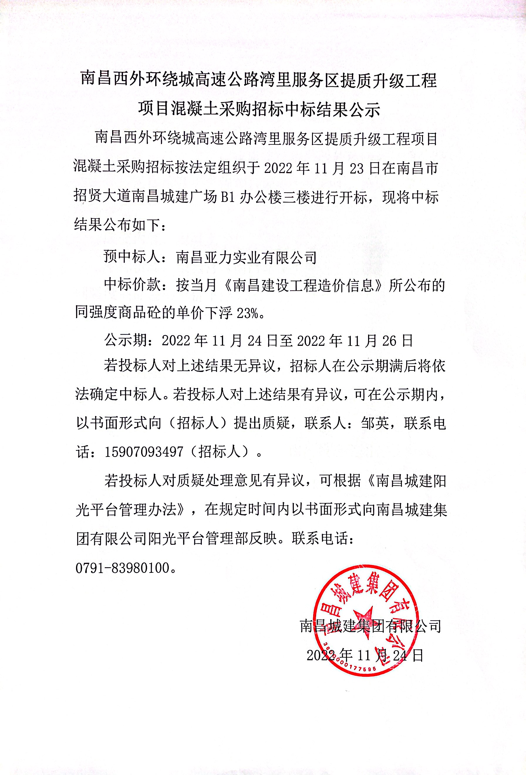 南昌西外环绕城高速公路湾里服务区提质升级工程项目混凝土采购招标按法定组织于2022年11月23日在南昌市招贤大道永利yl23411广场B1办公楼三楼进行开标,现将中标结果公布如下: