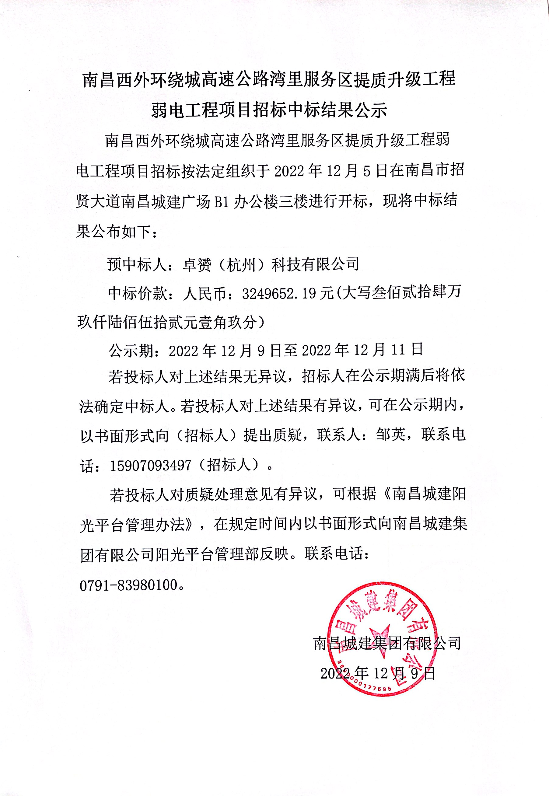 南昌西外环绕城高速公路湾里服务区提质升级工程弱电工程项目招标按法定组织于2022年12月5日在南昌市招贤大道永利yl23411广场B1办公楼三楼进行开标,现将中标结果公布如下: