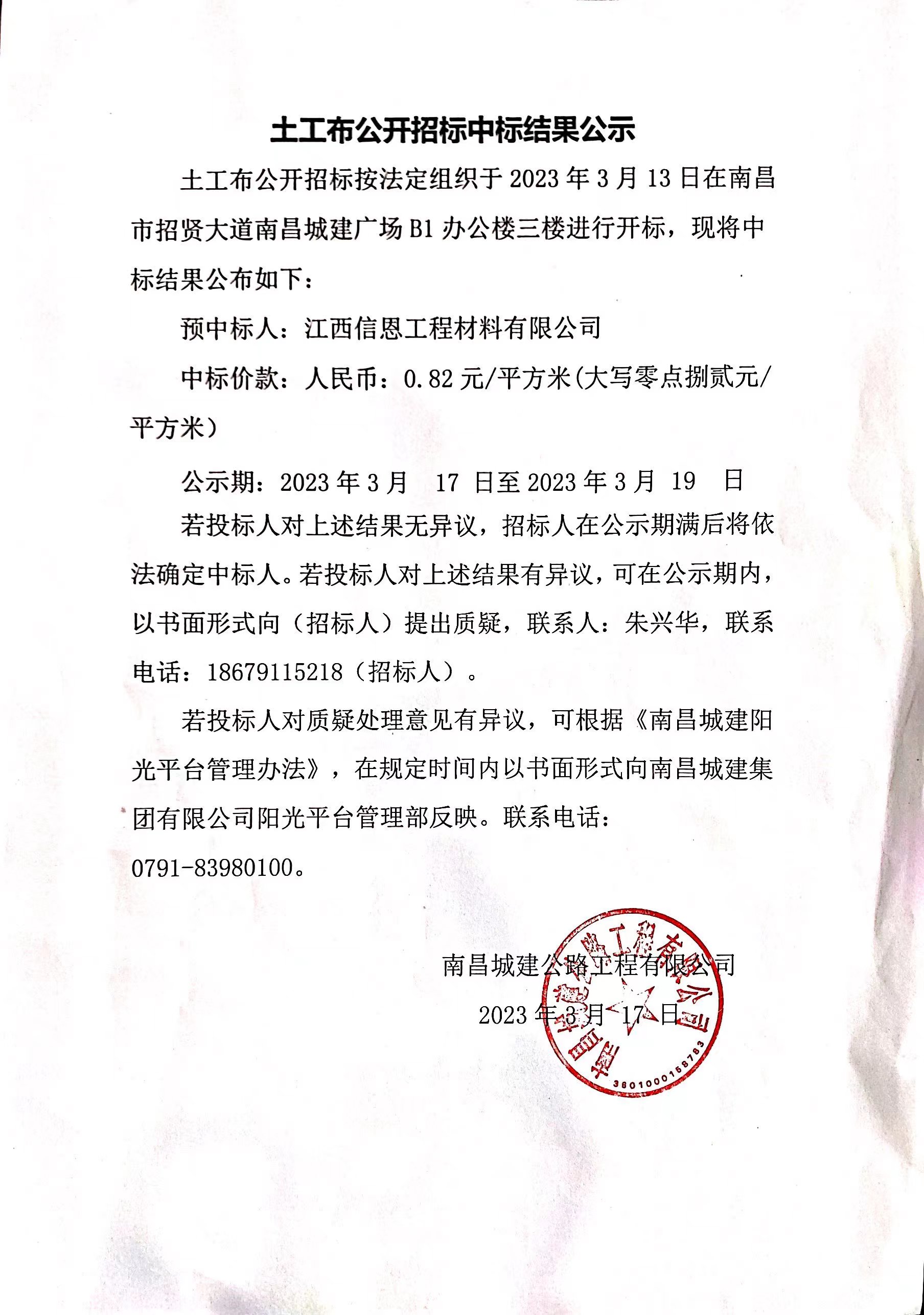 土工布公开招标按法定组织于2023年3月13日在南昌市招贤大道永利yl23411广场B1办公楼三楼进行开标,现将中标结果公布如下: