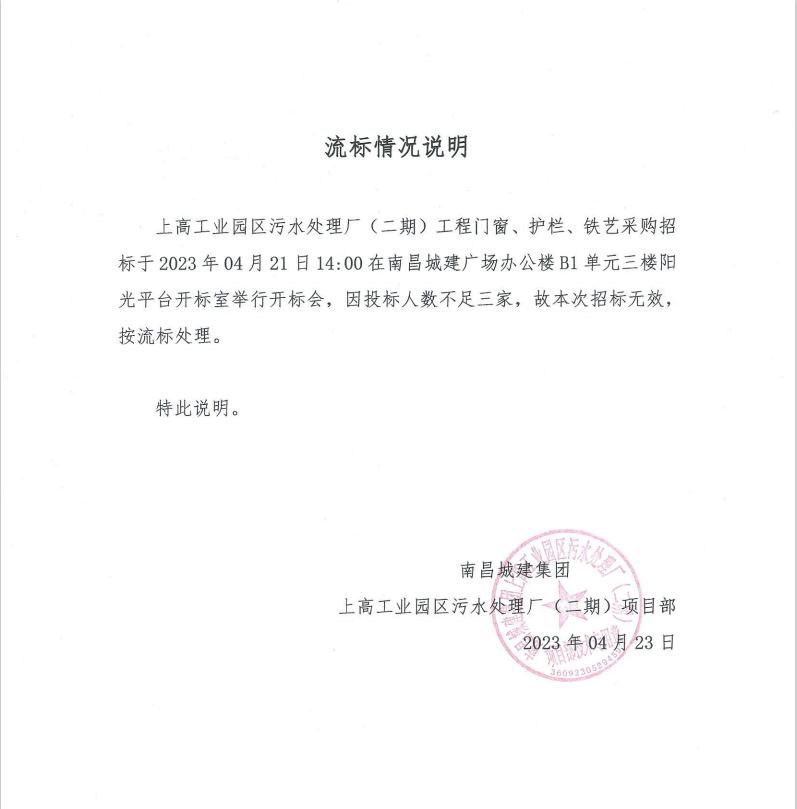 上高工业园区污水处理厂(二期)工程门窗、护栏、铁艺采购招标于2023年04月21日14:00在永利yl23411广场办公楼B1单元三楼阳光平台开标室举行开标会,因投标人数不足三家,故本次招标无效,按流标处理。