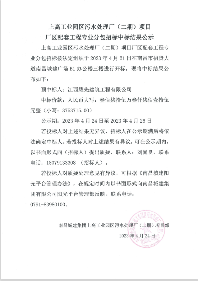 上高工业园区污水处理厂(二期)项目厂区配套工程专业分包招标按法定组织于2023年4月21日在南昌市招贤大道永利yl23411广场B1办公楼三楼进行开标,现将中标结果公布如下:
