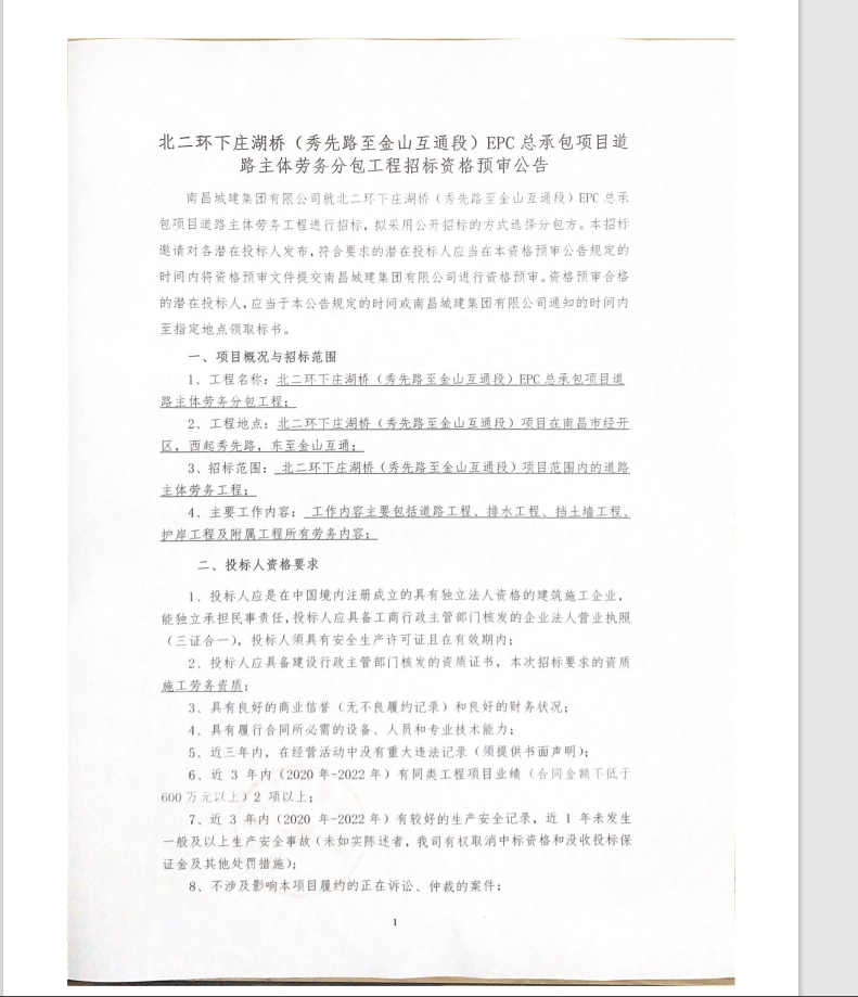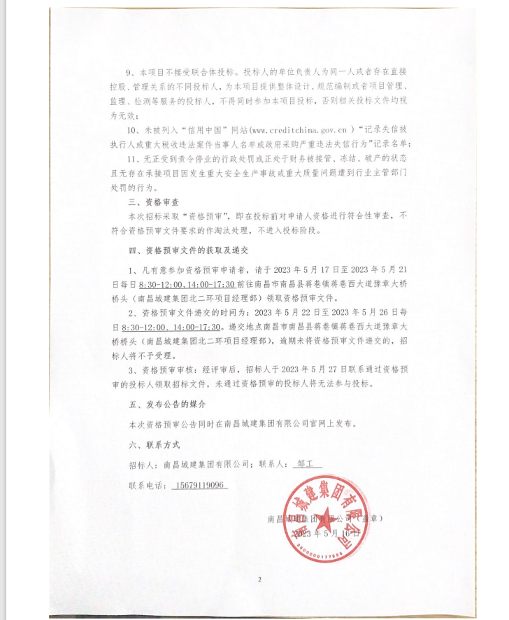 2、资格预审文件递交的时间为:2023年5月22日至2023年5月26日每日8:30-12:00、14:00-17:30。递交地点南昌市南昌县蒋巷镇蒋巷西大道豫章大桥桥头(永利yl23411集团北二环项目经理部),逾期未将资格预审文件递交的,招标人将不予受理。