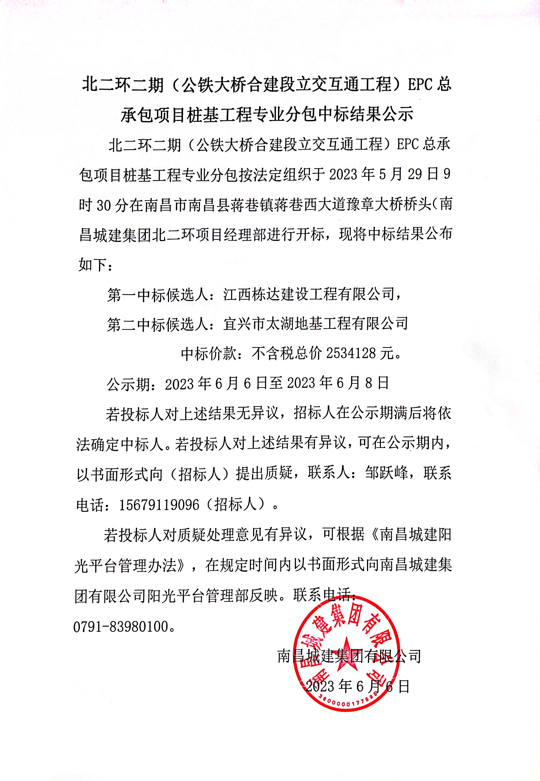 北二环二期(公铁大桥合建段立交互通工程)EPC总承包项目桩基工程专业分包按法定组织于2023年5月29日9时30分在南昌市南昌县蒋巷镇蒋巷西大道豫章大桥桥头(永利yl23411集团北二环项目经理部进行开标,现将中标结果公布如下: