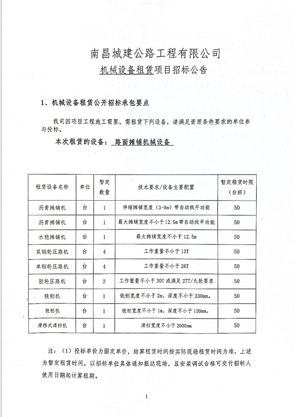 我司因项目工程施工需要,需租赁下列设备,请满足资质条件要求的单位参与投标。