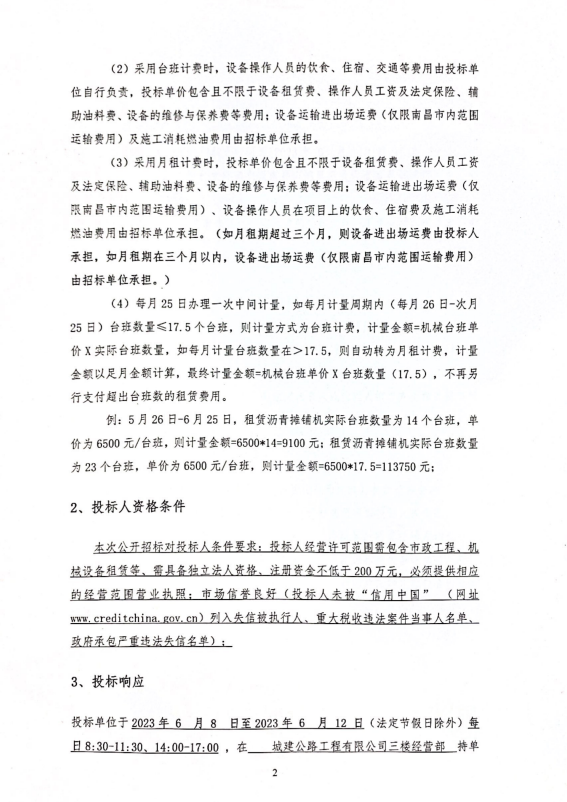 (3)采用月租计费时,投标单价包含且不限于设备租赁费、操作人员工资及法定保险、辅助油料费、设备的维修与保养费等费用;设备运输进出场运费(仅限南昌市内范围运输费用)、设备操作人员在项目上的饮食、住宿费及施工消耗燃油费用由招标单位承担。(如月租期超过三个月,则设备进出场运费由投标人承担,如月租期在三个月以内,设备进出场运费(仅限南昌市内范围运输费用)由招标单位承担。)