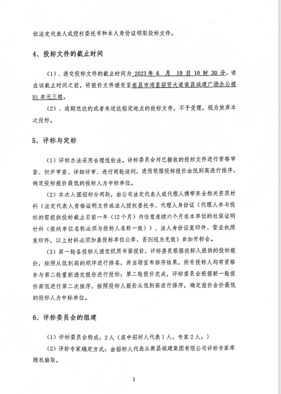 (1)、递交投标文件的截止时间为 2023年 6 月 19 日 10 时 30 分,请在该截止时间之前,将报价文件递交至南昌市湾里招贤大道永利yl23411广场办公楼B1单元三楼。