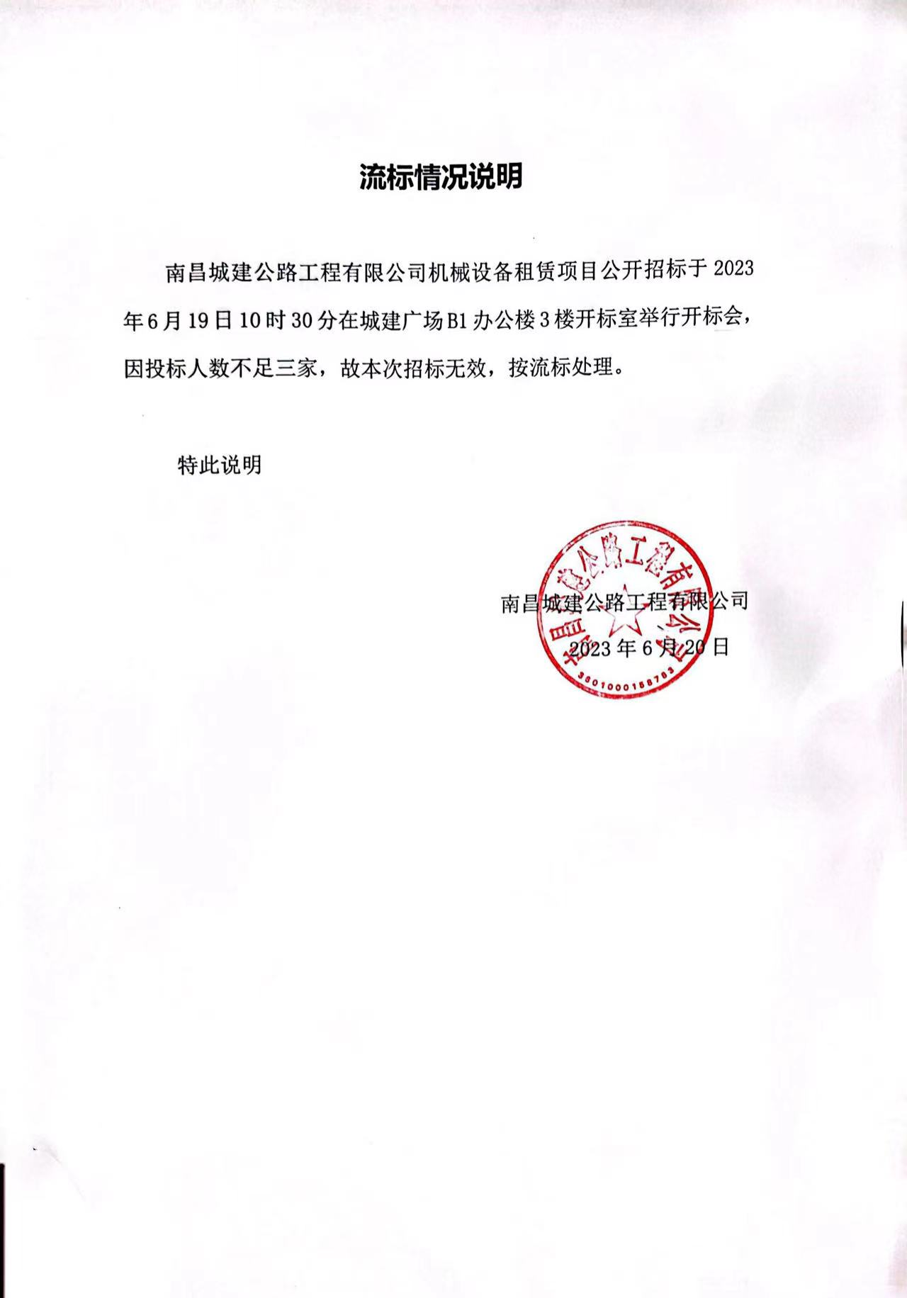 永利yl23411公路工程有限公司机械设备租赁项目公开招标于2023年6月19日10时30分在城建广场B1办公楼3楼开标室举行开标会,因投标人数不足三家,故本次招标无效,按流标处理。